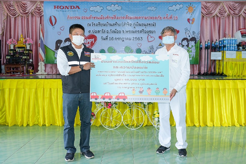 บริษัท ฮอนด้า ออโตโมบิล (ประเทศไทย) จำกัด สานต่อ โครงการ “Honda Dream School : ฮอนด้าชวนน้องรักษ์สิ่งแวดล้อมและความปลอดภัย” ซึ่งในปีนี้ได้ต่อยอดกิจกรรมในการเตรียมความพร้อมรับสถานการณ์การแพร่ระบาดเชื้อไวรัสโควิด-19 โดยได้เชิญชวนพนักงานฮอนด้าร่วมส่งต่อความห่วงใย รวมพลังอาสาร่วมกันผลิตอุปกรณ์ป้องกันเชื้อไวรัสโควิด-19 อาทิ ฉากป้องกันสำหรับติดตั้งบนโต๊ะอาหารและโต๊ะเรียนวิทยาศาสตร์ หน้ากาก Face shield แท่นเหยียบเจลแอลกอฮอล์ เจลแอลกอฮอล์แบบขวด เพื่อนำไปบริจาคและส่งมอบให้กับ 3 โรงเรียน ได้แก่ โรงเรียนสุเหร่าบางชัน กรุงเทพฯ โรงเรียนบ้านสร้าง (สำริต ภู่เงินอนุสรณ์) จ.พระนครศรีอยุธยา และโรงเรียนบ้านหว้าเอน จ.ปราจีนบุรี นอกจากนี้ ฮอนด้า ยังมอบผลิตภัณฑ์ในกลุ่มเครื่องยนต์อเนกประสงค์ของฮอนด้า ได้แก่ เครื่องพ่นยาแบบสะพายหลัง ให้กับทางโรงเรียน อีกทั้งช่วยพัฒนาสิ่งแวดล้อมและปรับปรุงภูมิทัศน์ของโรงเรียน เพื่อให้เอื้อต่อการสอนของครูและการเรียนรู้ของเด็ก พร้อมส่งต่อสังคมคุณภาพอีกด้วย