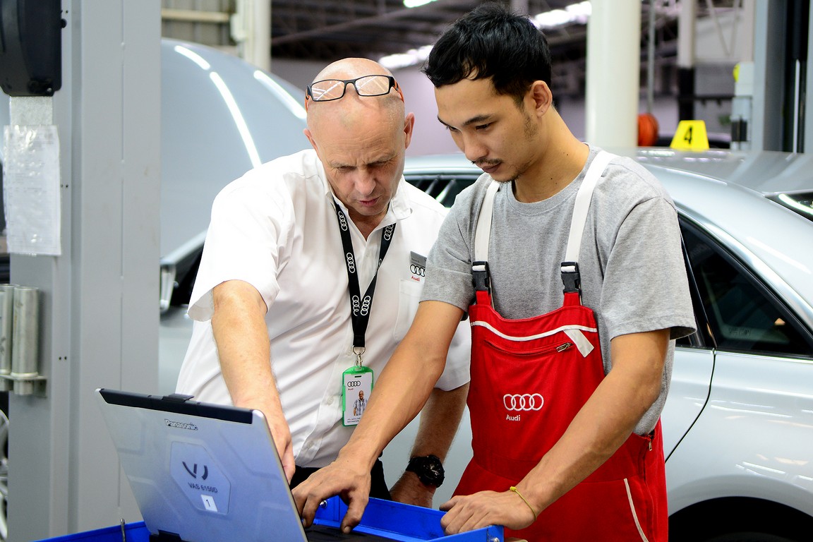 ซึ่งนอกจากจะมีผู้จัดการส่วนงานบริการเป็นชาวไอริช ที่มีประสบการณ์ยาวนานกับ Audi ถึง 28 ปี เคยคุมดีลเลอร์ที่ใหญ่ที่แอฟริกาใต้มาก่อน เรายังสนับสนุนให้หัวหน้าช่างสอบระดับ Master Technician เป็นระดับสูงสุดของช่าง Audi ซึ่งเป็นคนไทยคนแรกที่ได้รับใบประกาศเกียรติบัตรจากโครงการนี้ ในส่วนของช่างเทคนิคมีการส่งทีมไปอบรมที่ประเทศสิงคโปร์