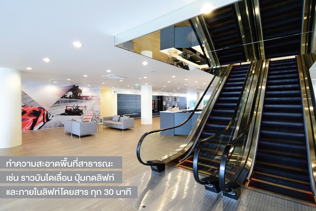 ในส่วนของความปลอดภัยโดยรอบทั้งภายในและภายนอกอาคาร มีการพ่นน้ำยาฆ่าเชื้อ เช็ดทำความสะอาดพื้น ผนัง อุปกรณ์ เครื่องใช้สำนักงาน เครื่องมือ ลิฟท์ ราวบันได ราวจับประตู และห้องรับรองลูกค้า โซฟา ทุกๆ ชั่วโมง ทั้งนี้เรามีการอบโอโซนทำความสะอาดทั้งอาคารเพื่อให้ลูกค้ามั่นใจว่าเราตระหนักถึงความปลอดภัยของลูกค้าที่เข้ามาใช้ศูนย์บริการเป็นอย่างมาก โดยติดตั้งจุดบริการเจลล้างมือทั่วอาคาร และเตรียมหน้ากากอนามัยให้ลูกค้าด้วย