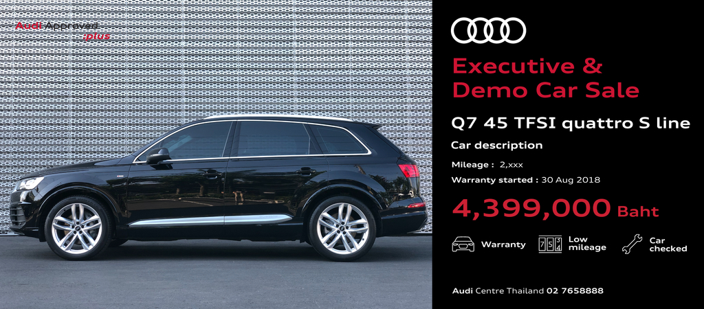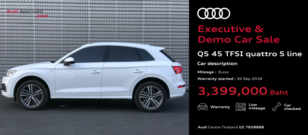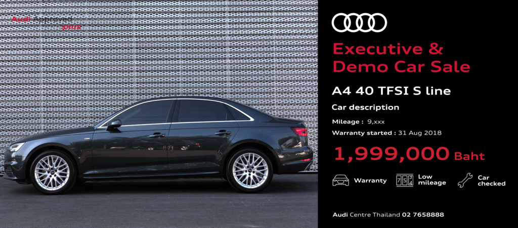 เหนือกว่าความคุ้มค่าที่ไม่ต้องรอ เมื่ออาวดี้ ประเทศไทย ยกทัพรถผู้บริหาร และรถทดลองขับ ป้ายแดง ไมล์น้อย รับรองคุณภาพโดย อาวดี้ ประเทศไทย ให้เป็นเจ้าของ ในราคาสุดพิเศษ เริ่มต้นเพียง 1.699 ล้านบาท  พร้อมให้การรับประกันต่อเนื่องเหมือนรถใหม่ ภายในงานAudi Executive & Demo  Car Sale” ที่สำนักงานใหญ่  Audi Centre Thailand เพียง 3 วัน 1-3 กุมภาพันธ์นี้ เท่านั้น เผยมีจำนวนจำกัด หมดแล้วหมดเลย