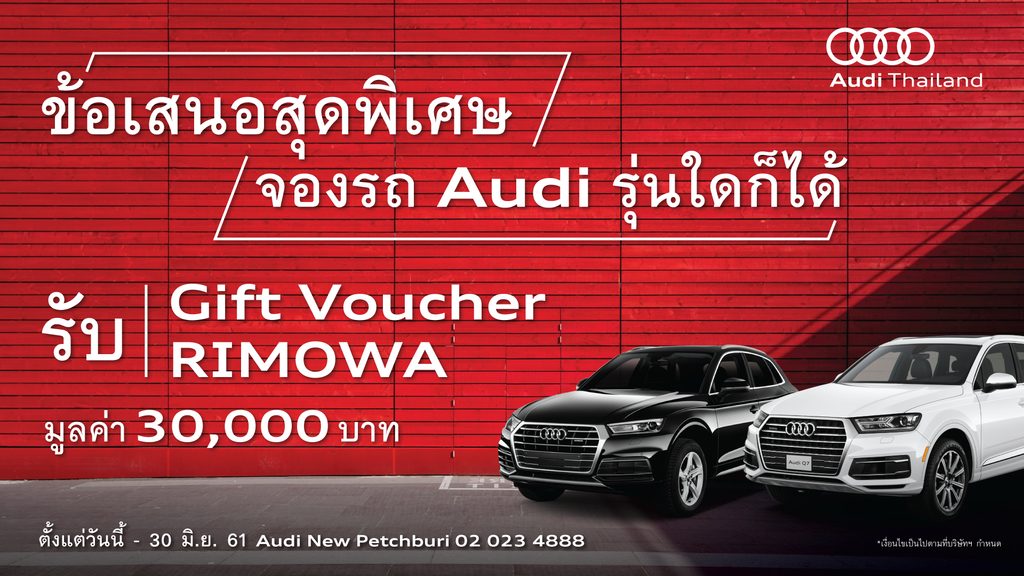 ล่าสุด อาวดี้ ประเทศไทย ได้จัดโปรโมชั่นให้กับลูกค้าที่จองรถใหม่ด้วยการมอบ Gift Voucher กระเป๋า RIMOWA มูลค่า 30,000 บาท*ให้ลูกค้าที่จองรถใหม่ระหว่างตั้งแต่วันนี้ 30 มิถุนายน 2561