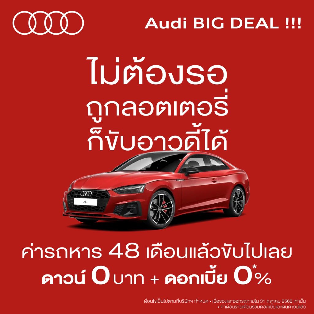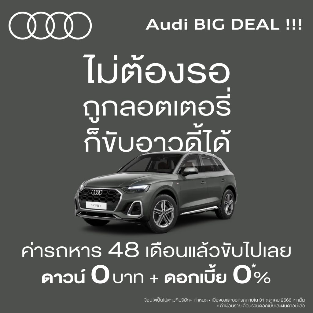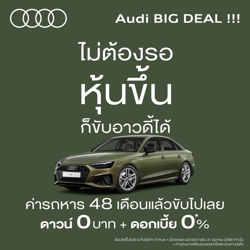 อาวดี้ จัดแคมเปญแรง ข้อเสนอสุดพิเศษ Audi BIG DEAL!!! ออกรถอาวดี้ตั้งแต่วันนี้จนถึง 31 ตุลาคมนี้ รับข้อเสนอ ดาวน์ 0 บาท และดอกเบี้ย 0% นาน 4 ปี ไม่ต้องมีเงินดาวน์และไม่มีดอกเบี้ย ลูกค้าที่สนใจสามารถผ่อนชำระค่างวด โดยนำราคารถหาร 48 งวด ได้เลย