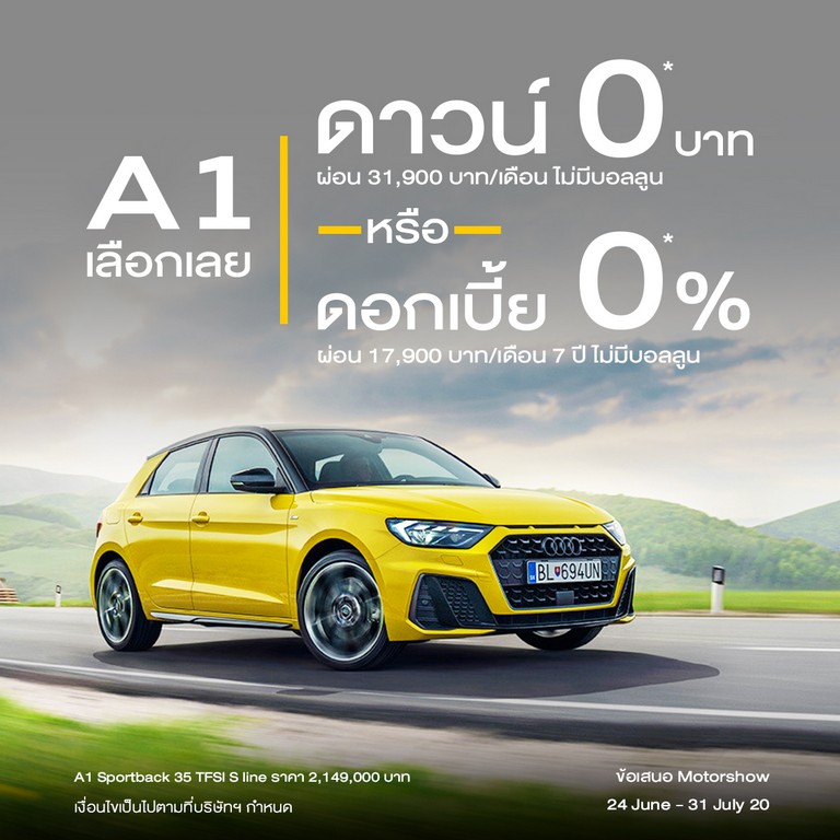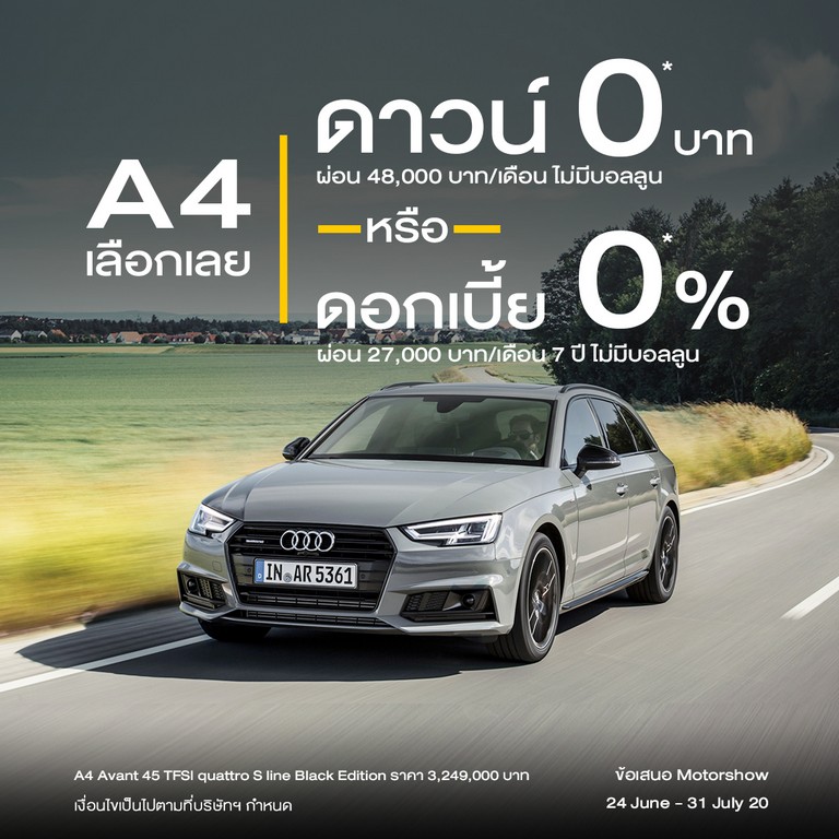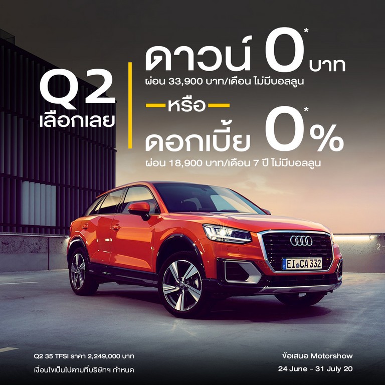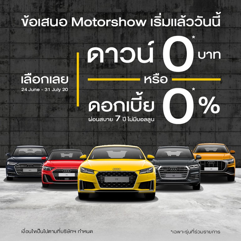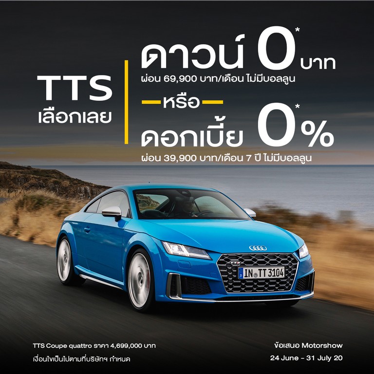 - เลือกระหว่าง ดาวน์ 0 บาท หรือ โปรแกรมผ่อนสบายๆ ดอกเบี้ย 0% นาน 7 ปี ***ไม่มีบอลลูน อาทิเช่น A1, A4 Avant, A8L, Q2, Q5, Q8, TT Coupé, TT Roadster และ TTS