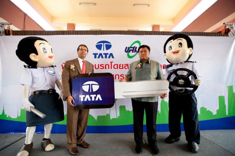 นายอจิต เวนคาทารามาน (ซ้าย) ประธานเจ้าหน้าที่บริหาร บริษัท ทาทา มอเตอร์ส (ประเทศไทย) จำกัด ส่งมอบรถมวลชน ทาทา สตาร์บัส ซีเอ็นจี (TATA Starbus CNG) 2 รุ่น ให้กับ นายโอภาส เพชรมุณี (ขวา) ผู้อำนวยการองค์การขนส่งมวลชนกรุงเทพ หรือ ขสมก. เพื่อให้ทาง ขสมก. นำไปวิ่งใช้งาน และได้สัมผัสกับสมรรถนะและความทันสมัยของรถมวลชนมาตรฐานระดับสากล ของ ทาทา มอเตอร์ส