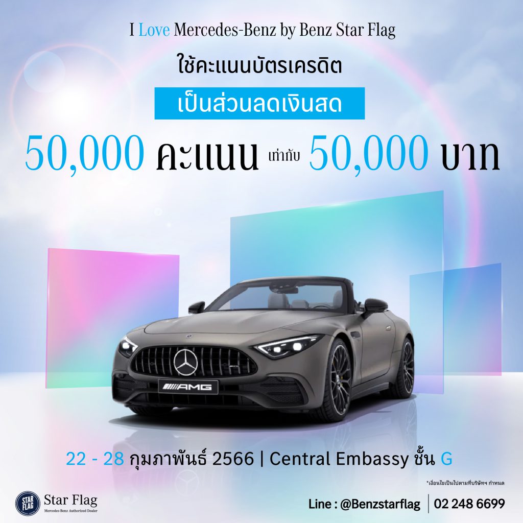 ในงาน “I Love Mercedes-Benz by Benz Star Flag” ทาง เบนซ์ สตาร์แฟลก ยังมอบสิทธิพิเศษ สำหรับสมาชิก The One Card ด้วยการแจกพ้อยส์ รวมมูลค่าถึง 1 ล้านพ้อยส์ ให้กับลูกค้าที่จองรถภายในงานและออกรถภายในวันที่ 20 มีนาคมศกนี้ ส่วนผู้ถือบัตรเครดิตที่ร่วมรายการ สามารถนำพ้อยส์ มาแลกเป็นส่วนลดได้สูงสุดถึง 50,000 บาท ขณะที่ลูกค้าที่อยาก Trade-in กับ Benz Star Flag ก็สามารถทำได้เลย โดยจะได้รับส่วนลดเพิ่มมูลค่าสูงสุดถึง 100,000 บาท