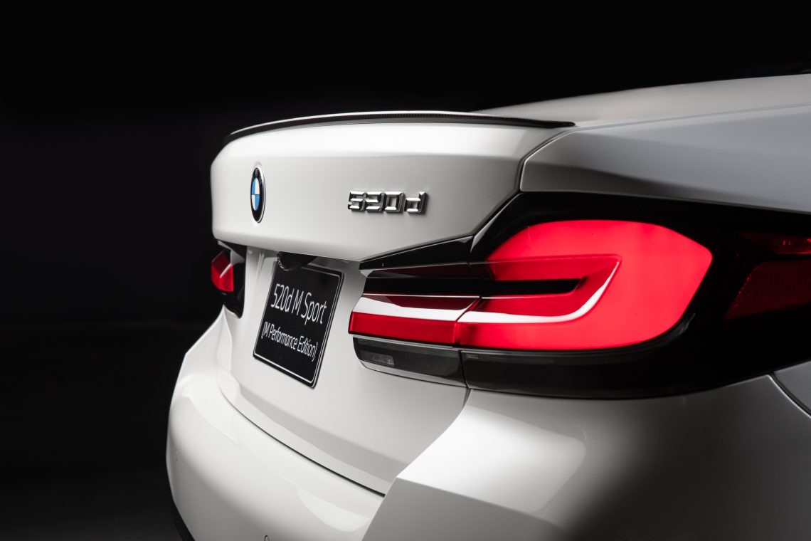 ดีไซน์ด้านท้ายรถของบีเอ็มดับเบิลยู 520d M Sport (M Performance Edition) สื่อถึงรูปลักษณ์ที่ผสานความสง่างามและล้ำสมัยด้วยเส้นสายที่คมชัดและทรงพลังเช่นเดียวกัน ไฟท้าย LED มาในรูปแบบสามมิติทรงตัว L รับกับไฟหน้า โฉบเฉี่ยวด้วยกรอบสีดำ สร้างความสะดุดตาบนท้องถนน โดยทั้งไฟท้ายและไฟเบรกได้รับการออกแบบมาให้กลมกลืนเป็นหนึ่งเดียว ทำให้รถยนต์รุ่นนี้มีรูปโฉมไม่ซ้ำใคร บีเอ็มดับเบิลยู 520d M Sport (M Performance Edition) ยังเสริมลุคสปอร์ตด้วยท่อไอเสียทรงสี่เหลี่ยมคางหมูที่ท้ายรถทั้งสองด้านซึ่งรวมเป็นส่วนหนึ่งของกันชนท้ายไว้ได้อย่างลงตัว นอกจากนี้ แพ็คเกจ M Performance ของบีเอ็มดับเบิลยู 520d M Sport (M Performance Edition) ใหม่ ยังเพิ่มความสปอร์ตให้กับดีไซน์หรูหราของบีเอ็มดับเบิลยู ซีรีส์ 5 มาพร้อมกับอุปกรณ์ตกแต่งแบบเอ็กซ์คลูซีฟ ซึ่งรวมถึงกระจังหน้าทรงไตคู่คาร์บอนไฟเบอร์ M Performance, สปลิทเตอร์หน้าคาร์บอนไฟเบอร์ M Performance, สปอยเลอร์หลังคาร์บอน, ฝาครอบกระจกคาร์บอน, แถบสติ๊กเกอร์ข้างตัวรถ M Performance และสติ๊กเกอร์สัญลักษณ์ M Performance บริเวณสเกิร์ตข้าง