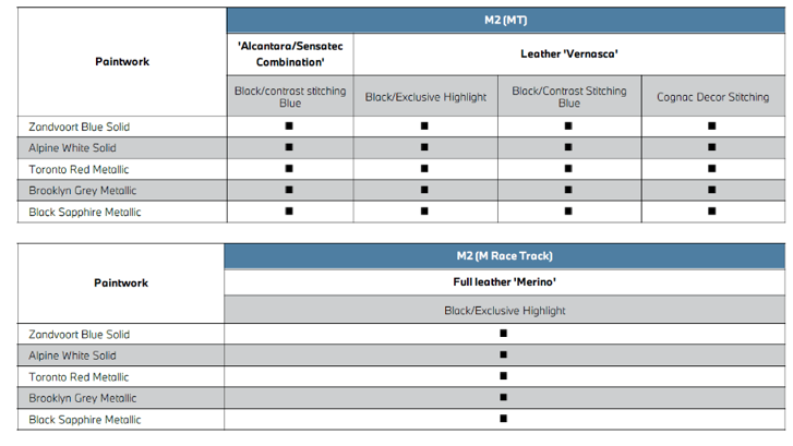 āļāļĩāđāļāđāļĄāļāļąāļāđāļāļīāļĨāļĒāļđ M2 āļĄāļēāđāļŦāđāđāļĨāļ·āļāļ 5 āļŠāļĩ āđāļāđāđāļāđ āļŠāļĩāļāđāļē Zandvoort Blue Solid, āļŠāļĩāļāļēāļ§ Alpine White, āļŠāļĩāđāļāļē Brooklyn Grey Metallic, āļŠāļĩāļāļģ Black Sapphire Metallic āđāļĨāļ°āļŠāļĩāđāļāļ Toronto Red Metallic āļāđāļēāļāđ āđāļāđāđāļāđ