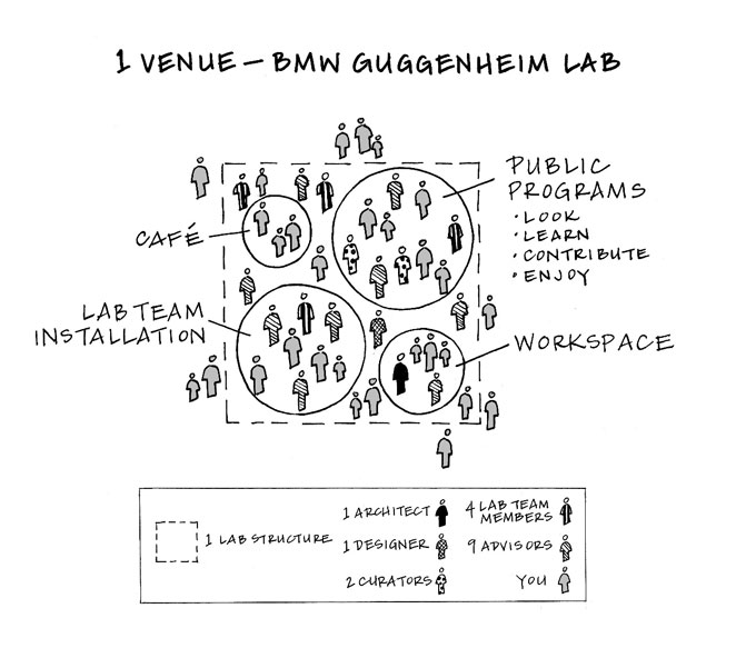 BMW Guggenheim Lab แห่งแรกได้รับการสร้างสรรค์แบบโดยทีมสถาปนิก Atelier Bow-Wow จากกรุงโตเกียว ประเทศญี่ปุ่น และบริษัทกราฟฟิคดีไซน์ Sulki & Min จากกรุงโซล ประเทศเกาหลื โครงสร้างขนาด 5,000 ตารางเมตรนี้จะเริ่มเปิดใช้งานในปลายปีหน้า “โดยปกติแล้ว ไอเดียด้านการออกแบบของเราสร้างอยู่บนพื้นฐานของความแปลกใหม่ ผสมผสานกับฟังก์ชั่นการใช้งาน ภายใต้พื้นที่จำกัดอย่างเช่นในเมืองขนาดใหญ่ ซึ่งการได้ร่วมสร้าง BMW Guggenheim Lab ในครั้งนี้ เรารู้สึกตื่นเต้นเป็นอย่างมาก เพราะว่าแนวคิดและดีไซน์ของเราจะได้เป็นเวทีในการสร้างสรรค์ความคิดและไอเดียที่แปลกใหม่ต่อไป” โยชิฮารุ ซึกาโมโต แห่ง Atelier Bow-Wow กล่าว