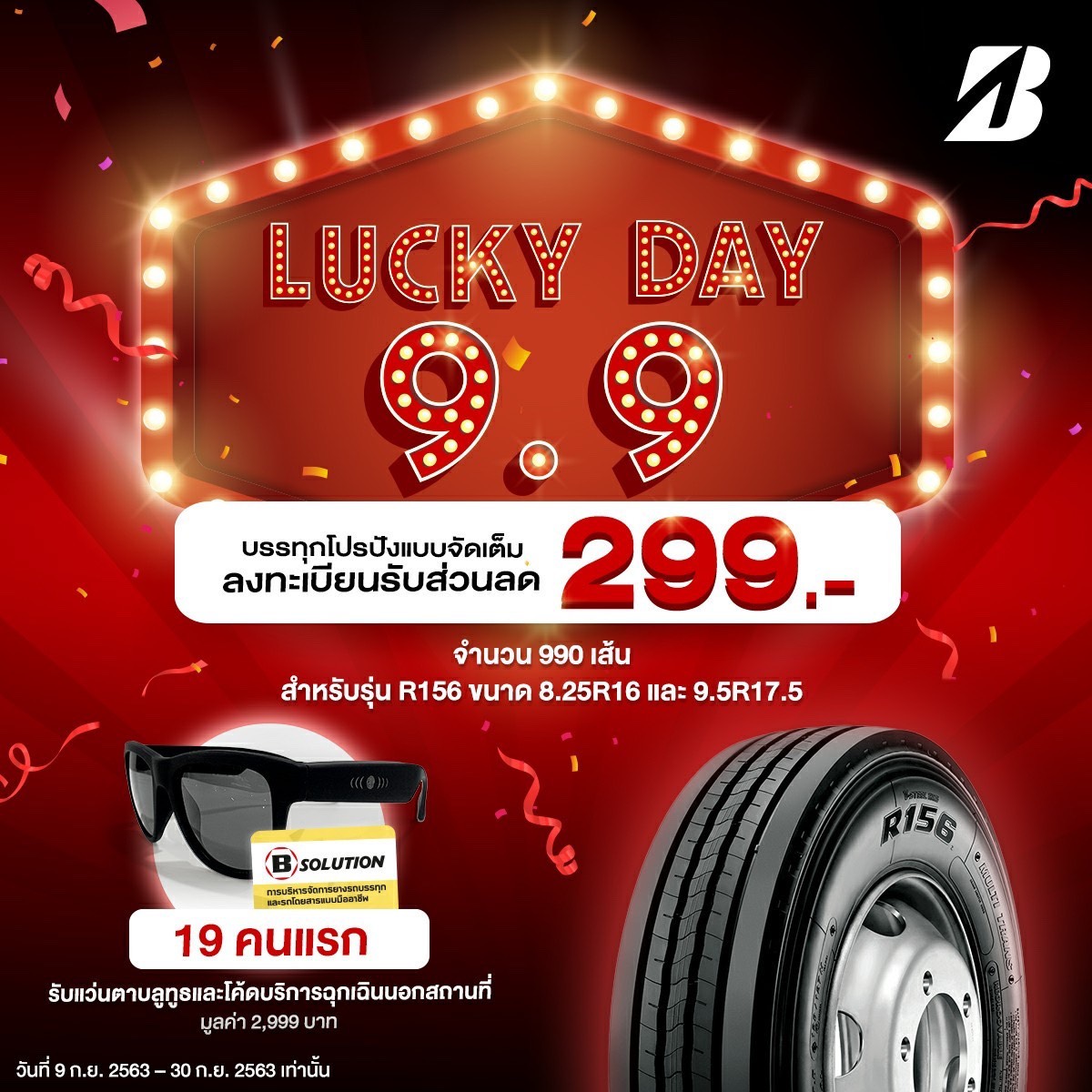 รถโดยสาร, รถบรรทุก, และรถเชิงพาณิชย์ชั้นนำในประเทศไทย ส่งแคมเปญสุดพิเศษแก่ผู้ใช้ยางรถบรรทุกและรถโดยสารขนาดกลางทั่วประเทศ ต้อนรับเดือนกันยายนกับแคมเปญ “LUCKY DAY 9.9” แทนคำขอบคุณลูกค้าที่ให้การสนับสนุนบริดจสโตน โดยมอบส่วนลด 299 บาท สำหรับลูกค้าที่ลงทะเบียนซื้อยางบริดจสโตนรุ่น R156 ขนาด 8.25R16 และ 9.5R17.5* เริ่มต้นในวันที่ 9 กันยายน และใช้สิทธิ์ได้จนถึงวันที่ 30 กันยายน 2563