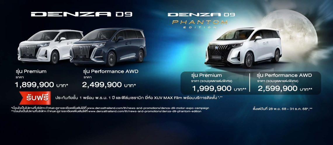 เปิดตัวครั้งแรกของไทย DENZA D9 Phantom Edition เพิ่มความสง่างามจากชุดตกแต่งสเกิร์ตรอบคันทั้งยังพร้อมติดตั้งกระจังหน้าแบบใหม่สเกิร์ตรอบคันดีไซน์สปอร์ตและชุดสปอยเลอร์นอกจากนั้นภายในติดตั้งจอเพดานระบบสัมผัสสำหรับผู้โดยสารตอนหลังขนาด 15.6 นิ้วให้ทุกท่านเพลิดเพลินตลอดการเดินทาง