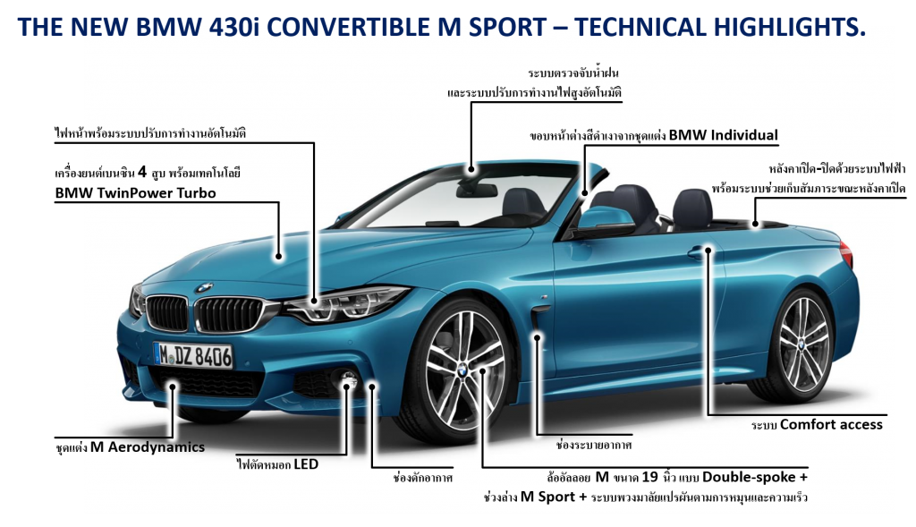 ขณะที่ BMW 430i Convertible M Sport  โดดเด่นด้วยช่วงล่าง M Sport และชุดแต่ง M Aerodynamics ล้ออัลลอย M ขนาด 19 นิ้วแบบ 2 สไตล์ และขอบหน้าต่างสีดำเงาจากชุดแต่ง BMW Individual หลังคาภายในตกแต่งอย่างสวยงามลงตัวด้วยวัสดุสีดำ anthracite จาก BMW Individual พร้อมด้วยระบบเสียงรอบทิศทางจาก Harman Kardon ที่แถมความสนุกมาให้ด้วย และขับสนุกขึ้นด้วย Paddle Shift
