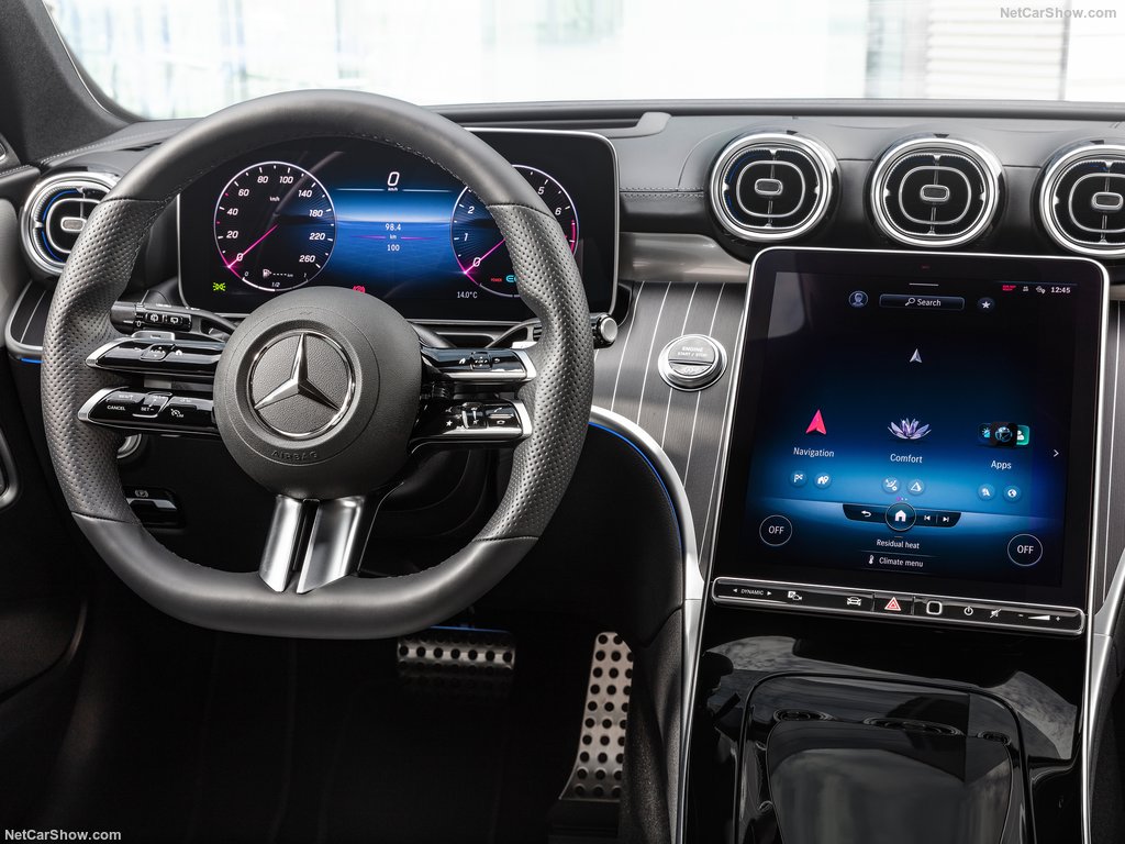 ภายในมีหน้าจอแสดงผลระบบอินโฟเทนเมนท์ MBUX ขนาดใหญ่ 11.9 นิ้ว ส่วนมาตรวัดเป็นแบบฟูลดิจิทัลขนาด 12.3 นิ้ว แต่ในยุโรปจะจออินโฟเทนเมนท์ขนาดเล็กกว่าที่ 9.5 นิ้วและมีจอมาตรวัด 10.25 นิ้ว ช่องแอร์ดีไซน์ทรงกลม พื้นที่ใช้สอยในห้องโดยสารของ C-Class Sedan อยู่ที่ 455 ลิตร แต่สำหรับรุ่น C-Class Wagon มีอยู่ที่ 490 ลิตร และสามารถเพิ่มขึ้นเป็น 1,510 ลิตรได้เมื่อพับเบาะแถวหลัง