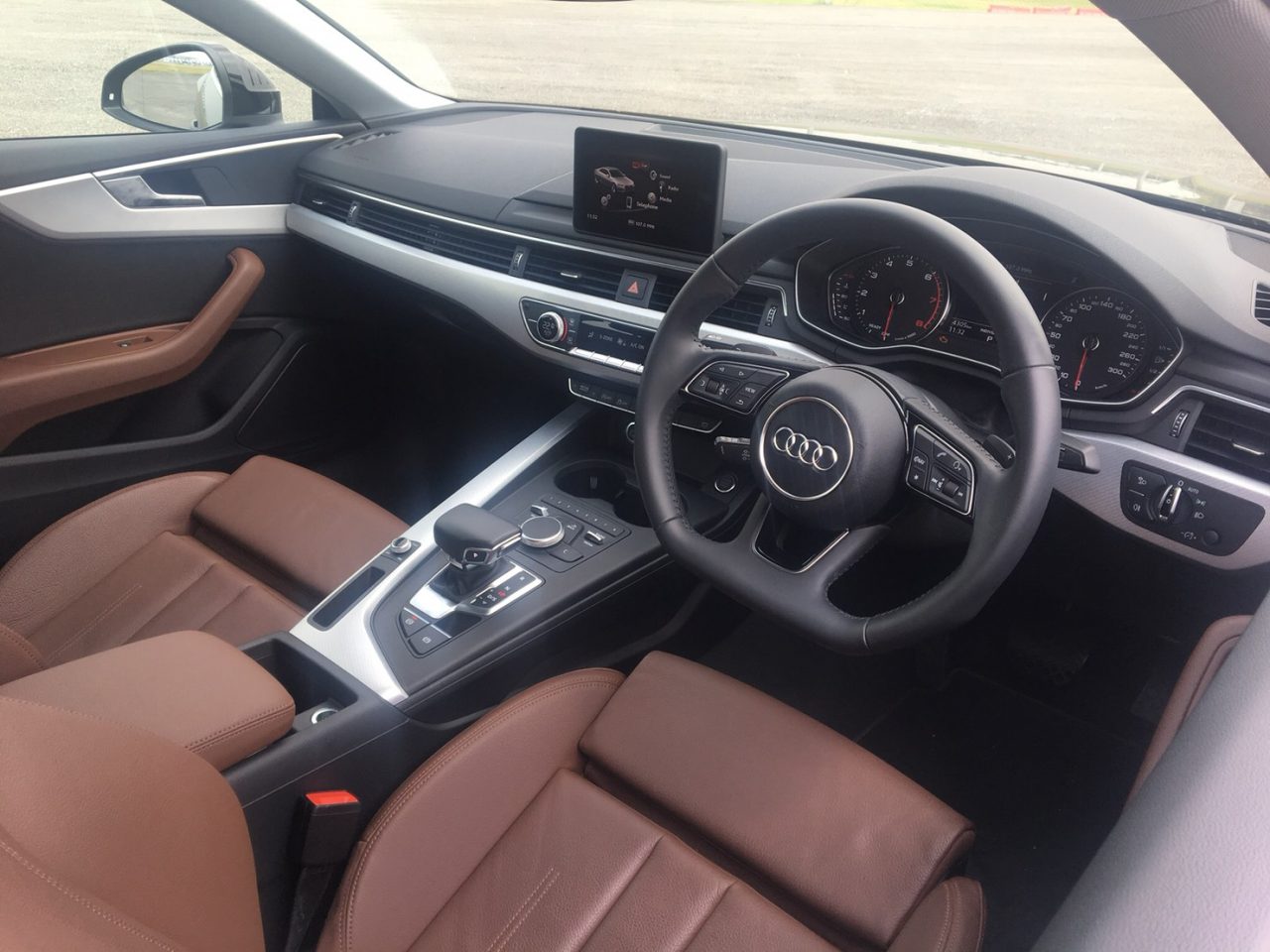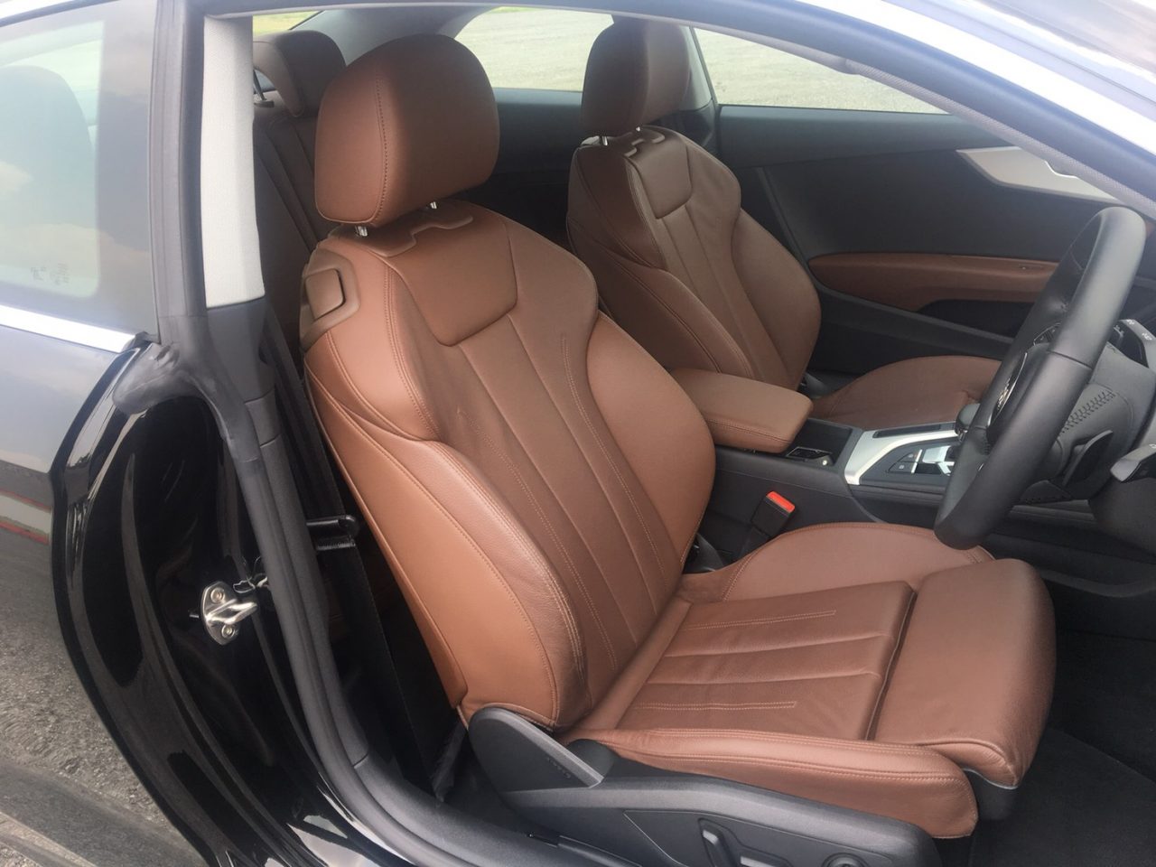 ภายในห้องโดยสาร Audi A5 Coupe 40 TFSI มากับความเรียบหรูด้วยการตกแต่งโทนสีดำ ตัดด้วยตัวเบาะนั่งสีน้ำตาล สามารถปรับท่านั่งด้วยระบบไฟฟ้า ที่สีอาจจะแปลกตาไปซักนิด