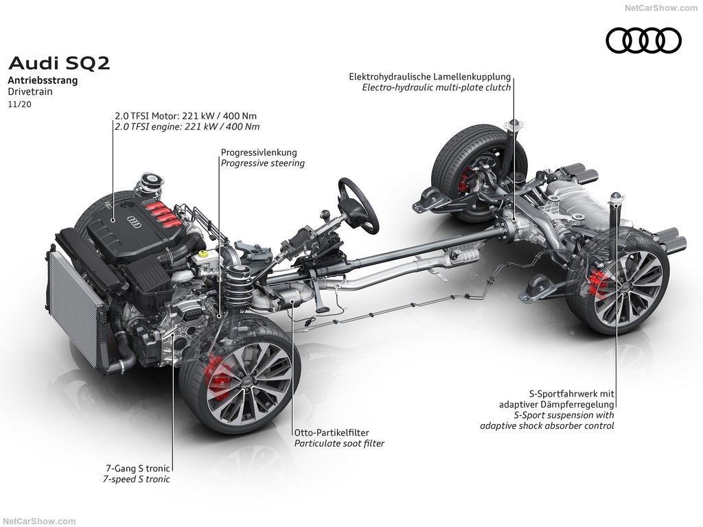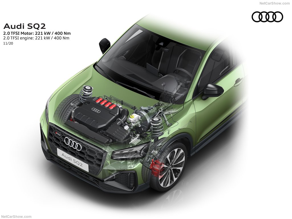 Audi SQ2 2021 ใช้เครื่องยนต์ TFSI ขนาด 2.0 ลิตร เกียร์ S tronic แบบ 7 สปีด ขับเคลื่อน 4 ล้อ ให้กำลังสูงสุด 296 แรงม้า แรงบิดสูงสุด 400 นิวตัน-เมตร อัตราเร่ง 0-100 กม./ชม ภายใน 4.9 วินาที และทำความเร็วสูงสุดได้ 250 กม./ชม.