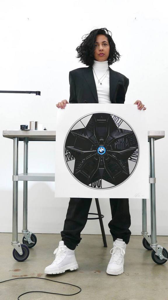 ขณะที่ Tonia Calderon ศิลปินสาวเชื้อสายเม็กซิกัน ดัชต์ อินโดนีเซีย และจีน เลือกจะสร้างสรรค์งานที่มีแรงบันดาลใจจากประสบการณ์ชีวิต ซึ่งทำให้คนดังมากมายหลายคนต่างก็สะสมงานของเธอ เช่น Alicia Keys, Dr. Dre และ Lady Gaga โดยผลงานของเธอมักจะสร้างขึ้นบนโครงสร้าง หรือพื้นผิวที่ทำให้ผู้ชมตั้งข้อสงสัย และสะท้อนความรู้สึก และครั้งนี้เธอประทับใจกับแพทเทิร์น (Pattern) และความสมมาตรของล้อ BMW iX3 เป็นพิเศษ จนเกิดความตั้งใจสร้างสรรค์องค์ประกอบเพิ่มเติม เพื่อที่จะช่วยเน้นดีไซน์เดิมของล้อให้โดดเด่นมากขึ้นไปอีกระดับนั่นเอง
