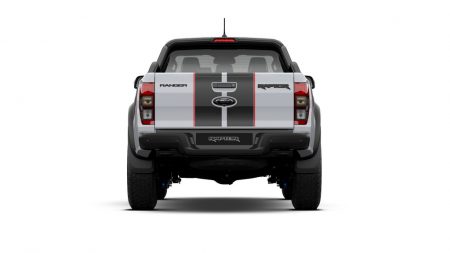 Ford Ranger Raptor X ถูกตกแต่งให้โดดเด่นยิ่งขึ้นด้วยสติ๊กเกอร์กราฟิกสไตล์ Over The Top รอบคัน เพิ่มความดุดันด้วยชุดแต่งสีดำ พร้อมโรลบาร์แบบยาว ชุดหูลากหน้ารถสีแดงสไตล์สปอร์ต และโลโก้ฟอร์ดสีดำบนท้ายกระบะ