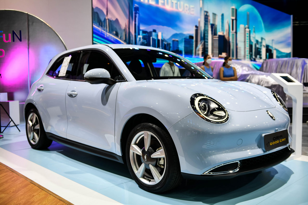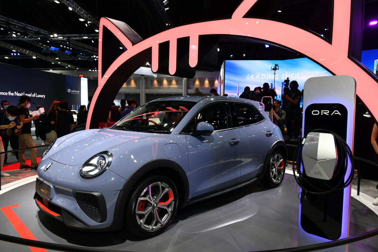 เช่นเดียวกับอีกหนึ่งสไตล์ที่จอดโชว์อยู่ข้างกัน คือ ORA Good Cat GT เหมียวไฟฟ้า 100% ที่นำมาเผยโฉมครั้งแรกในเมืองไทย พร้อมรูปลักษณ์ที่ผ่านการอัพเกรดดีไซน์ให้มีความสปอร์ตแบบชัดเจน ตั้งแต่ภายนอกที่เร้าใจด้วยการตกแต่งจากลวดลายคาร์บอนไฟเบอร์ พร้อมมุมมองด้านท้ายที่ดุดันด้วยสปอยเลอร์ ประทับตรา GT และกันชนหลังที่ออกแบบให้เป็น Diffuser รับกับล้ออัลลอยด์ขนาด 18 นิ้ว ตัดกับชุดคาลิปเปอร์เบรกโทนสีแดง