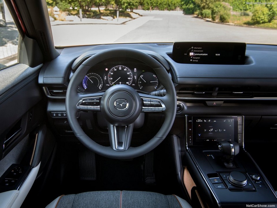 การดีไซน์ของเจ้า Mazda MX-30 EV ซึ่งเป็น SUV ครอสโอเวอร์สะท้อนความหรูหราล้ำสมัย คอนโซลกลางแบบลอย ช่องเก็บของอเนกประสงค์ทำจากไม้ก๊อก วัสดุที่เป็นพลาสติก หนังสังเคราะห์ ทำจากวัสดุรีไซเคิล ภายในประกอบด้วยหน้าจอดิจิตอลขนาดใหญ่ทั้ง มาตรวัด จออิโฟเทนเม้นท์ และจอสำหรับระบบปรับอากาศแบบสัมผัส
