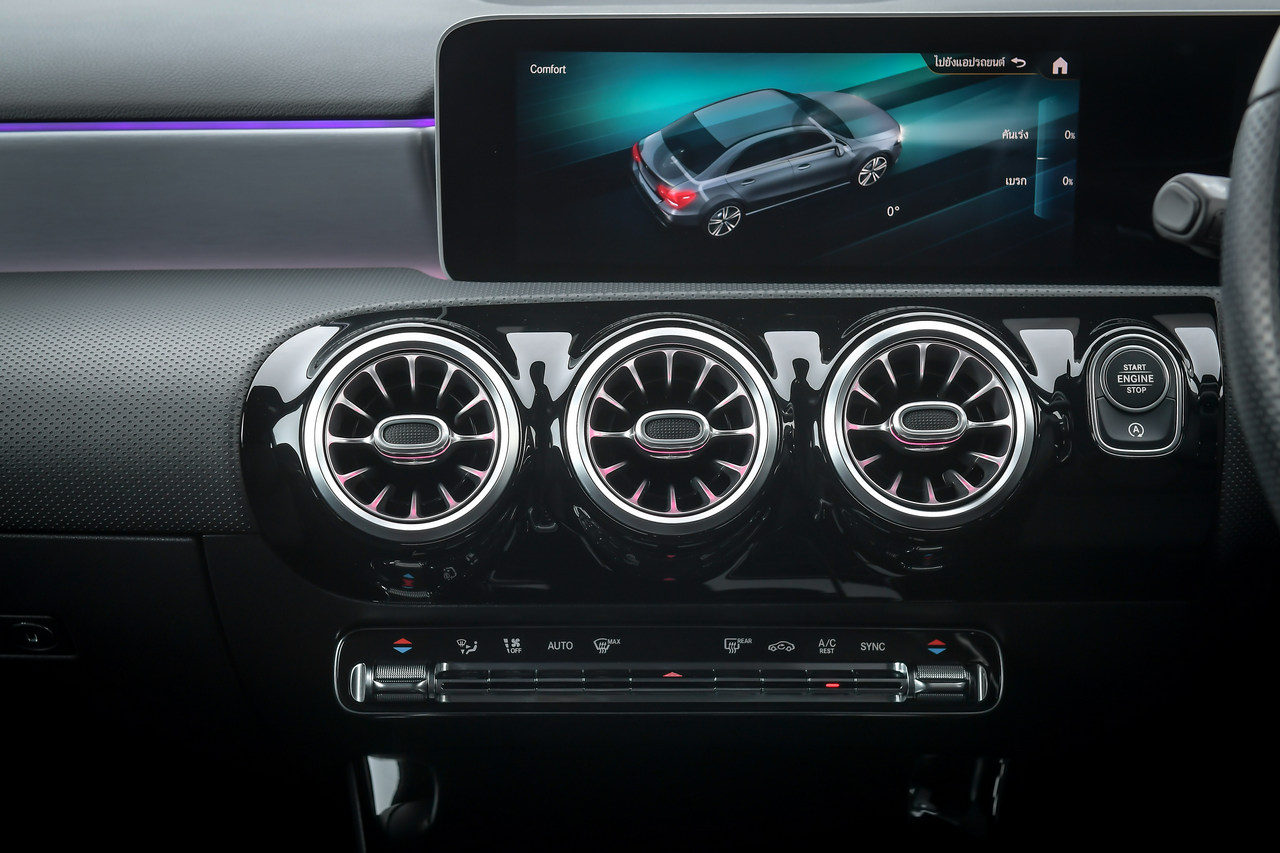 ตามด้วยรายละเอียดในการออกแบบ เช่น ช่องระบายอากาศของเครื่องปรับอากาศที่ได้รับการออกแบบจากแรงบันดาลใจ คือ ใบพัดของเครื่องบินเจ็ท (Turbine) และระบบไฟส่องสว่างแบบ Ambient Light ที่มีให้เลือกใช้ถึง 64 สี สำหรับปรับเปลี่ยนอารมณ์ ส่วนการตกแต่งยังคงเลือกใช้วัสดุเกรดพรีเมี่ยม พร้อมด้วยความต่างที่เกิดขึ้นจากแต่ละรุ่นย่อย เช่น ออพชั่น AMG Interior Package ที่จัดมาให้ในรุ่น A 200 AMG Dynamic เพื่อให้รับกับเบาะนั่ง Sports Seats หุ้มหนัง ARTICO สลับ DINAMICA microfibre สีดำ ตกแต่งด้วยเข็มขัดนิรภัย และการตัดเย็บเบาะด้วยด้ายสีแดง ตลอดจนพวงมาลัยมัลติฟังค์ชั่นแบบ Sports Steering Wheel ที่ตกแต่งด้วยหนัง Nappa ไปจนถึงชุดคันเร่ง และแป้นเบรกแบบสปอร์ต พร้อมปุ่มยางกันลื่น ที่ลงตัวกับพรมปูพื้นจาก AMG