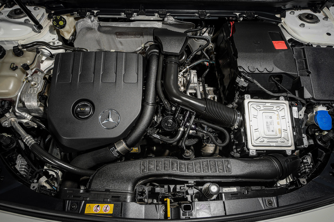 A-Class ทั้ง 2 รุ่นย่อย มากับขุมพลังบล็อกเดียวกัน คือ เครื่องยนต์เบนซิน 4 สูบ พร้อมระบบอัดอากาศ Turbocharged ที่มีขนาดเพียง 1,332 ซีซี แต่ให้พละกำลังสูงสุดได้ถึง 163 แรงม้า พร้อมแรงบิดสูงสุด 250 นิวตันเมตร จนเรียกได้ว่าเป็น Compact Car ที่มีกำลังมากที่สุดในโลก เมื่อเทียบกับรถขนาดเครื่องยนต์เท่ากัน ส่วนระบบส่งกำลังมากับเกียร์อัตโนมัติ 7 สปีด (7G-DCT) พร้อมแป้นเปลี่ยนเกียร์ที่พวงมาลัย (Steering-Wheel Gearshift Paddles) และความสามารถในการทำอัตราเร่งจาก 0-100 กม./ชม. ในเวลาเพียง 8.1 วินาที และความเร็วสูงสุดที่ระดับ 230 กม./ชม.