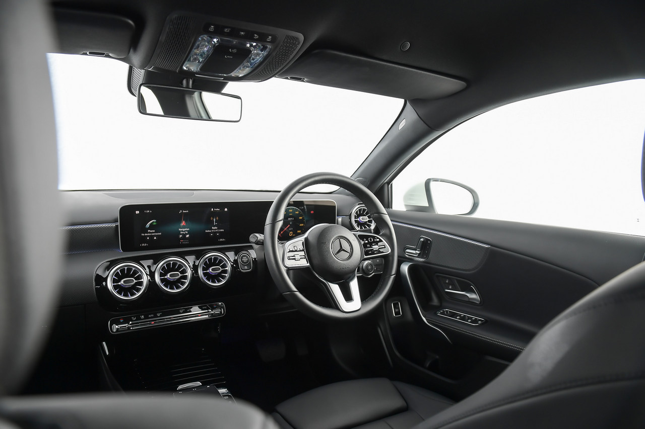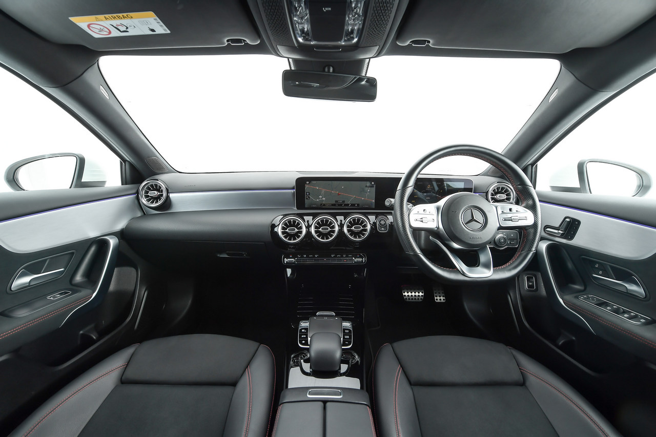 ตามด้วยรายละเอียดในการออกแบบ เช่น ช่องระบายอากาศของเครื่องปรับอากาศที่ได้รับการออกแบบจากแรงบันดาลใจ คือ ใบพัดของเครื่องบินเจ็ท (Turbine) และระบบไฟส่องสว่างแบบ Ambient Light ที่มีให้เลือกใช้ถึง 64 สี สำหรับปรับเปลี่ยนอารมณ์ ส่วนการตกแต่งยังคงเลือกใช้วัสดุเกรดพรีเมี่ยม พร้อมด้วยความต่างที่เกิดขึ้นจากแต่ละรุ่นย่อย เช่น ออพชั่น AMG Interior Package ที่จัดมาให้ในรุ่น A 200 AMG Dynamic เพื่อให้รับกับเบาะนั่ง Sports Seats หุ้มหนัง ARTICO สลับ DINAMICA microfibre สีดำ ตกแต่งด้วยเข็มขัดนิรภัย และการตัดเย็บเบาะด้วยด้ายสีแดง ตลอดจนพวงมาลัยมัลติฟังค์ชั่นแบบ Sports Steering Wheel ที่ตกแต่งด้วยหนัง Nappa ไปจนถึงชุดคันเร่ง และแป้นเบรกแบบสปอร์ต พร้อมปุ่มยางกันลื่น ที่ลงตัวกับพรมปูพื้นจาก AMG