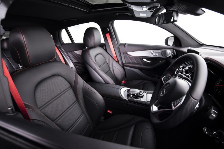 ภายในห้องโดยสารสะดุดตาด้วยเบาะนั่งคู่หน้าปรับไฟฟ้า พร้อมหน่วยบันทึกความจำแบบ AMG Sport Seat หุ้มด้วยวัสดุหนัง และผ้า DINAMICA Microfibre เดินตะเข็บด้ายสีแดง ตามด้วยการติดตั้งพวงมาลัยมัลติฟังก์ชั่นแบบสปอร์ตทรง D-Shape หุ้มด้วยหนัง Nappa คุณภาพสูง