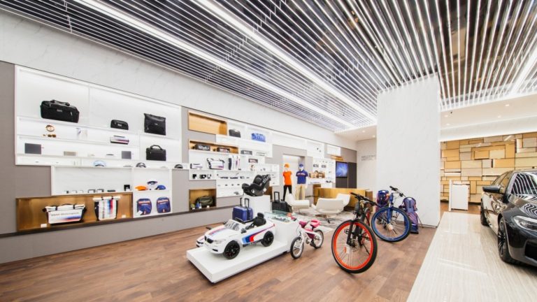 ขณะที่เพดานสูง 3.8 เมตร ให้ความรู้สึกโปร่งสบาย ออกแบบเป็นพิเศษ โดยใช้ฝ้าอะครีลิคที่ฝังแอลอีดีไว้ภายใน ช่วยให้เกิดเส้นแสงตกกระทบกับตัวถังรถ สร้างความรู้สึกหรูหราและมีความเป็นไดนามิค ซึ่งสามารถจัดแสดงรถได้สูงสุด 4 คัน ทั้งยนตรกรรมปลั๊ก-อิน ไฮบริด รุ่น BMW i8, BMW X5, BMW 7-Series รวมถึงตัวแรงสายพันธุ์ BMW M
