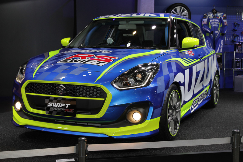 สำหรับเจ้า Suzuki Swift racer RS คันนี้มาด้วยสีตัวรถแบบน้ำเงินที่ไม่เข้มมาก ตัวเอาไว้ด้วยลวดลายสติกเกอร์ของ ทีม SUZUKI ECSTAR ของทีมแข่งมอเตอร์ไซค์ MotoGP ของ Suzuki