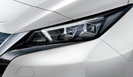 ภายนอกของ Leaf ใหม่ ติดตั้งไฟหน้าแบบ LED, ไฟส่องสว่างเวลากลางวันแบบ LED, กระจังหน้าทรง V-Motion สำหรับรถไฟฟ้าโดยเฉพาะ และล้ออัลลอยขนาด 17 นิ้ว