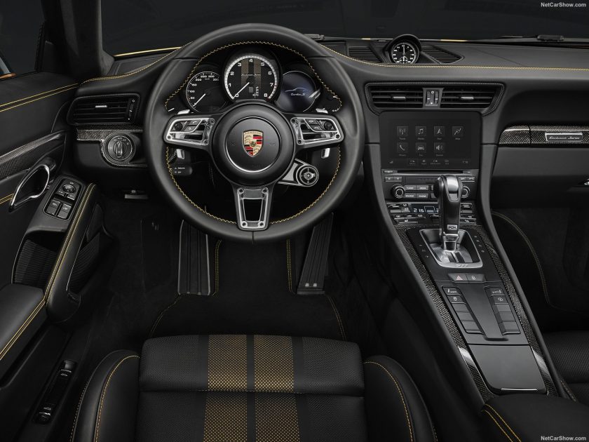 ส่วนภายในห้องโดยสารมากับผลงานที่ทำด้วยฝีมืออย่างปราณีต โดยใช้งานดีไซน์แนวทางเดียวกับภายนอก เช่นเบาะนั่งสปอร์ตปรับไฟฟ้า 18 ทิศทาง หุ้มหนัง 2 ชั้น สีดำคาดลายคู่สีเหลืองทอง Golden Yellow และปักโลโก้ Turbo S สีเดียวกันที่หัวหมอน ตลอดจนผ้าหลังคาซึ่งเลือกใช้หนัง Alcantara ก็ทำการคาดลายคู่สีเหลืองทอง Golden Yellow