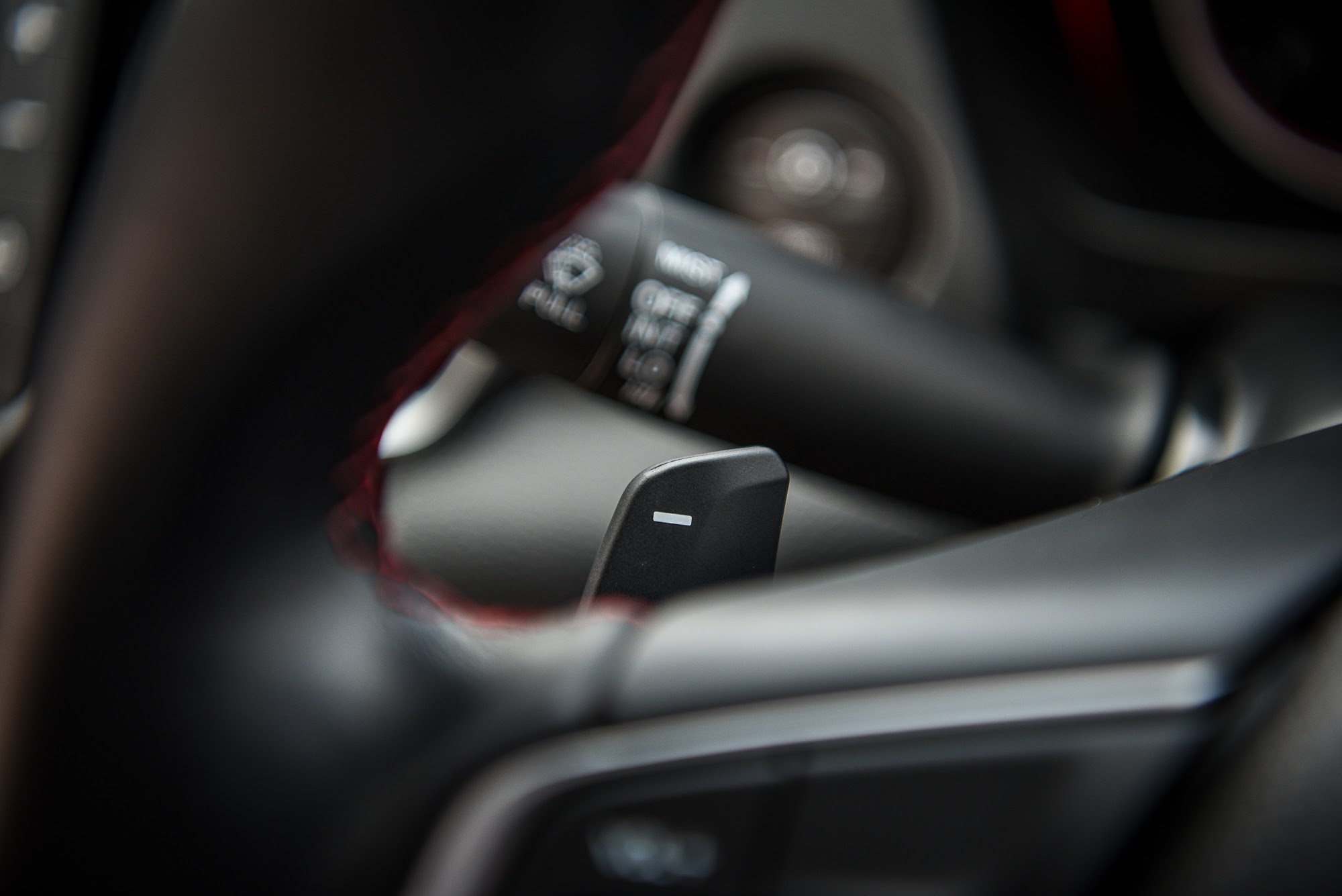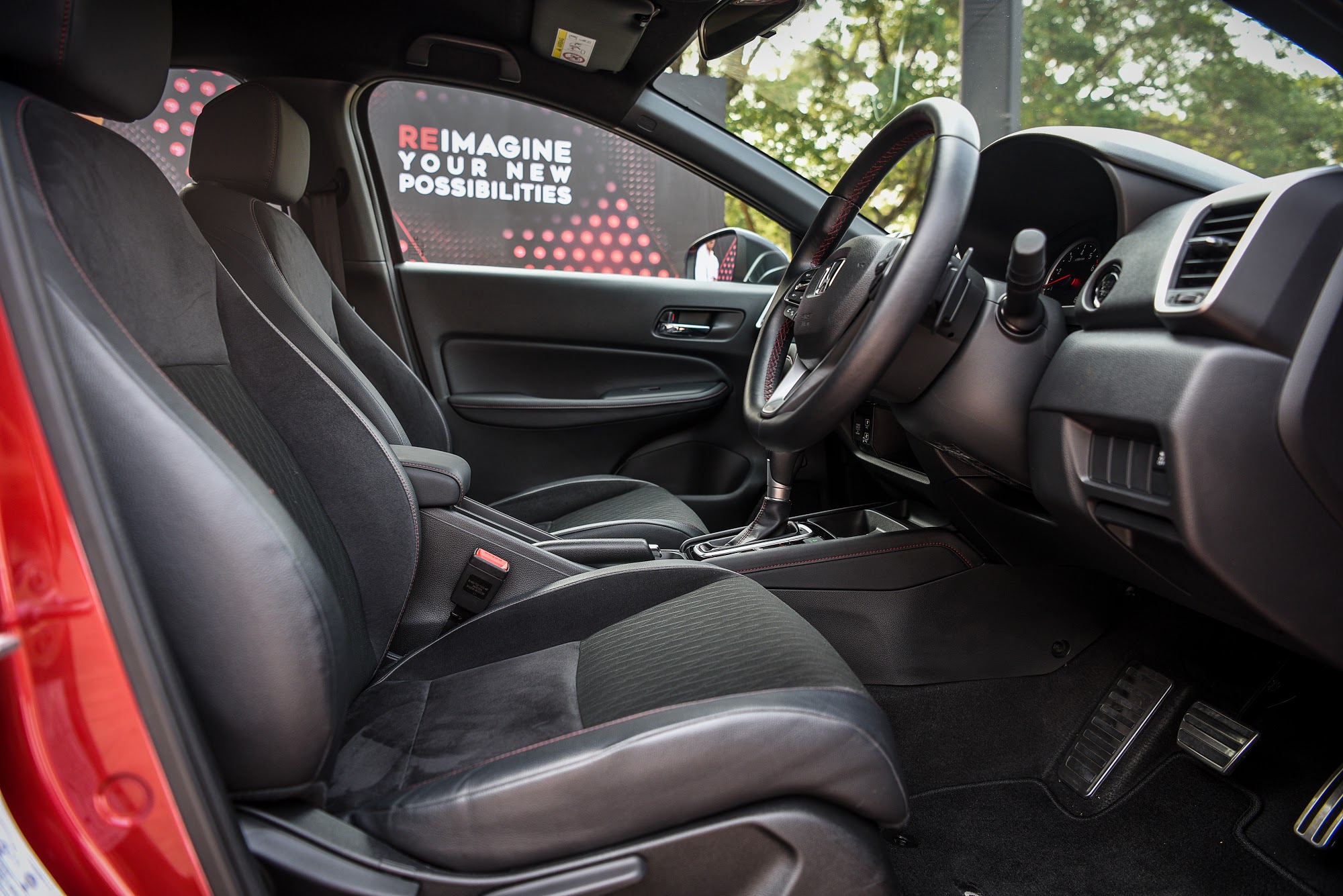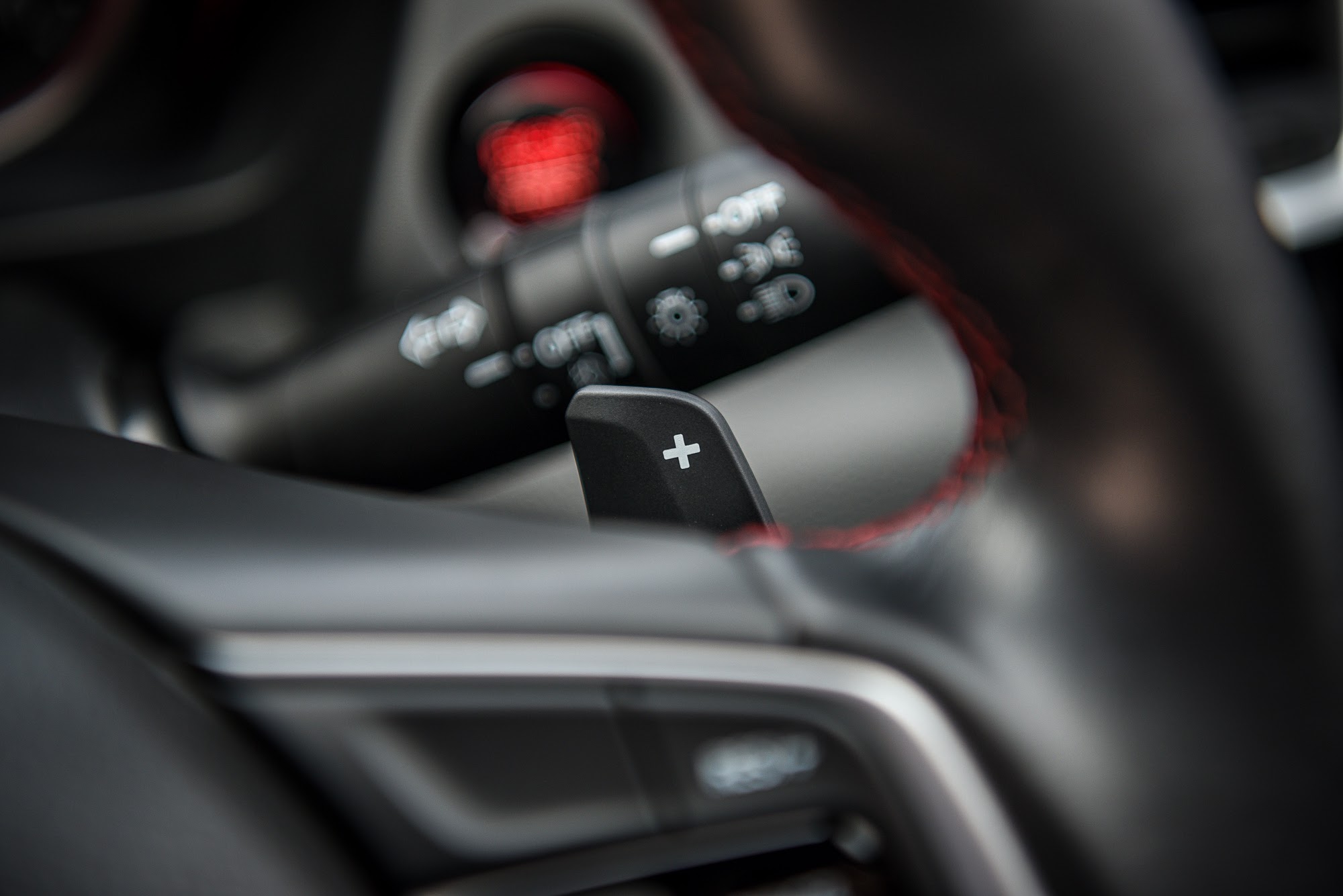 - ผิวสัมผัสของพวงมาลัยค่อนข้างดีมาก ดูหรูหรา ออกแบบแบบ 3 ก้านดูสปอร์ตด้วยด้ายแดง อวบ จับกระชับมือ พร้อมปุ่มมัลติฟังก์ชั่นทางด้านซ้าย และพวกครูสคอนโทรลทางด้านขวา แถมยังมี paddle shift ที่ทำให้ศักดิ์ศรีดูทัดเทียมกับรถรุ่นใหญ่ๆ กว่านี้