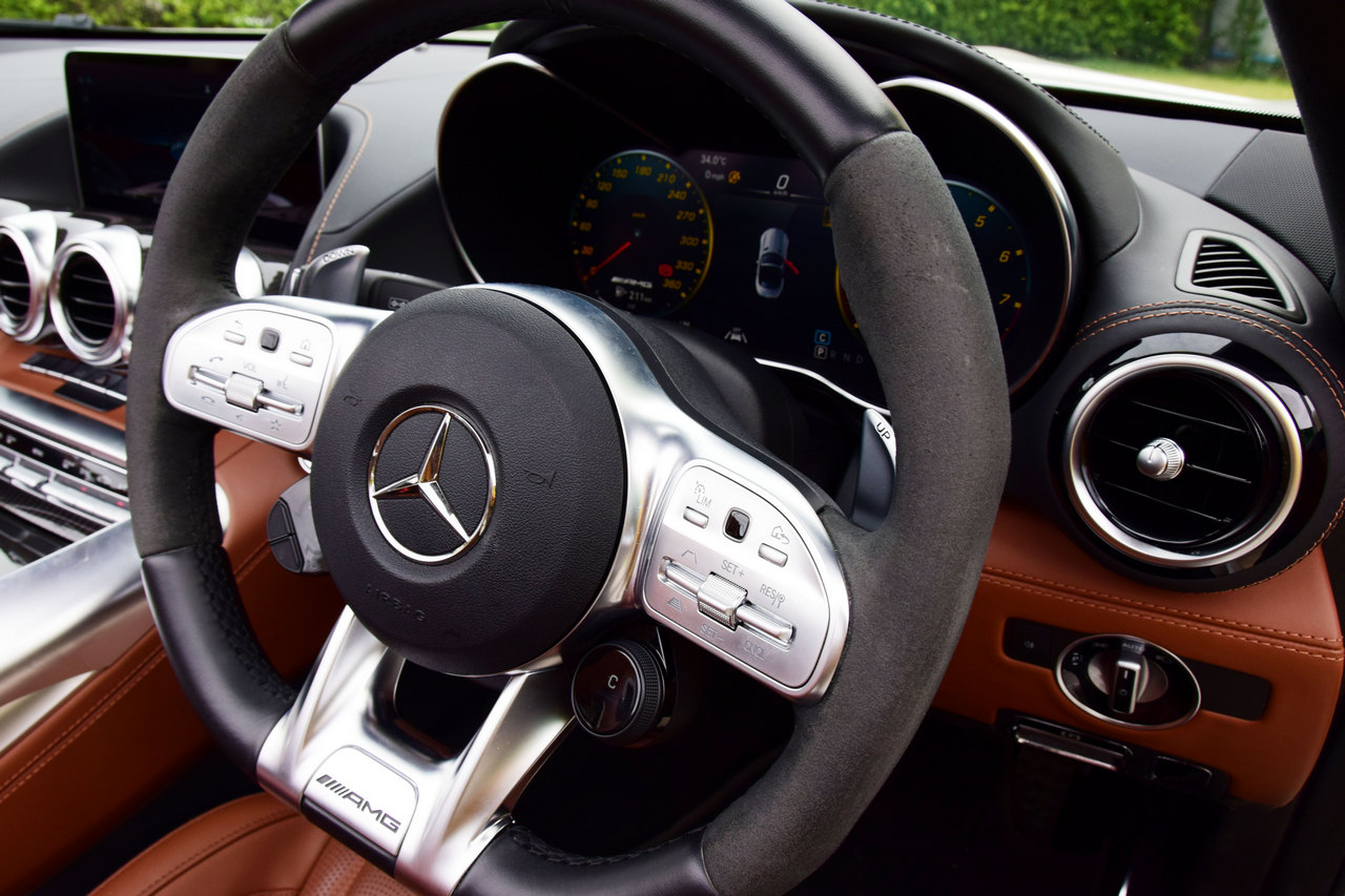 ส่วนภายใน “ชัดเจน” กับความเป็นรถ 2 ที่นั่ง แถมในทุกกระเบียดนิ้วยังมาพร้อมกับการเลือกใช้วัสดุที่หรูหราสมราคา และมาตรฐานของ Mercedes-AMG ไม่ว่าจะเป็น พวงมาลัยทรง D–Shape, เบาะนั่งทรงสปอร์ตที่ออกแบบมาได้อารมณ์ใกล้เคียง Bucket Seat นอกจากนี้ยังแฝงด้วยการสื่อถึงขุมพลังผ่านงานดีไซน์ และการจัดวางปุ่มควบคุมบน คอนโซลเกียร์ ขณะที่ระบบความบันเทิง และสิ่งอำนวยความสะดวกเต็มรูปแบบเท่าที่คุณนึกได้ว่าอยากให้มี … เอาเป็นว่าเราขอตัดบทเรื่องรายละเอียดดีกว่า เพราะมันเป็นเรื่องง่ายมาก หากคุณต้องการดูข้อมูล