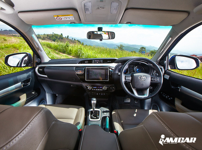 ระหว่างทางมาดูในส่วนของภายใน Toyota Hilux Revo Double Cab 2.8G Diesel A/T กันครับ ความกว้างขวางมีมากอยู่แล้ว แต่สิ่งที่น่าสนใจคือ “นี่เหรอรถกระบะ” เนื่องจากฟังก์ชั่นที่มีมาให้มากมายเหลือล้น ผมจะค่อยๆ ไล่ให้ฟังนะครับว่ามีอะไรบ้าง เริ่มต้นที่คอนโซลหน้าจากฝั่งคนนั่งจะเห็นช่องเก็บสัมภาระ 2 ช่อง ช่องด้านล่างเป็นช่องเก็บของปกติ แต่ด้านบนสามารถเป็น Cool Box เก็บความเย็นได้ด้วย เราสามารถเอาน้ำกระป๋องมาแช่เย็นได้ด้วย โดยในช่องนี้จะมีช่องทางออกของระบบปรับอากาศในรถเสริมขึ้นมาด้วย สามารถเปิด-ปิดได้ ตรงกลางคอนโซลจะเห็นความโดดเด่นของจอระบบสัมผัสที่มีไว้แสดงข้อมูลการขับขี่ต่างๆ เป็นกล้องมองหลัง และยังเป็นระบบนำทาง ขยับลงมาจะเห็นระบบปรับอากาศแบบดิจิตอล และคอนโซลเกียร์แบบอัตโนมัติพร้อมระบบ Manual ที่ใช้งานง่ายๆ มาดูต่อที่พวงมาลัยสามารถปรับได้ 4 ทิศทาง ต้องบอกว่านี่คือ พวงมาลัยกระบะยุคใหม่ เพราะมีปุ่มปรับฟังก์ชั่นต่างๆ มากมาย ทั้งให้ส่วนควบคุมการทำงานต่างๆ โทรศัพท์ และระบบควบคุมความเร็วอัตโนมัติ ที่สำคัญยังมีระบบ Push Start และ Mode การใช้งานแบบ Eco ที่ใช้งานแบบประหยัด หรือ Power Mode ที่สามารถเรียกกำลังเครื่องยนต์มาอย่างเต็มที่ ในส่วนของเบาะนั่งขนาดใหญ่แบบปรับไฟฟ้าด้านคนขับ ส่วนด้านหลังมีพนักผิงทุกจุด พร้อมมีระบบปรับอากาศด้านหลังด้วย ความรู้สึกผมถือว่าครบถ้วนมากครับสำหรับฟังก์ชั่นต่างๆ ส่วนที่ผมรู้สึกชอบมากๆ คงจะเป็นระบบ Eco และ Power Mode ซึ่งส่วนตัวผมไม่เคยคาดคิดว่าจะมีให้ในกระบะจริงๆ