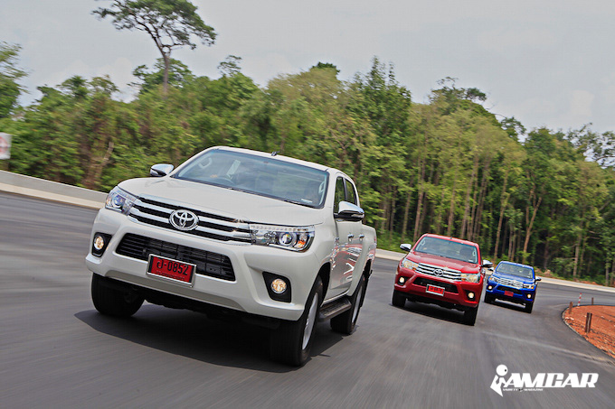 หลังจากที่ TOYOTA Hilux Revo “โตโยต้า ไฮลักซ์ รีโว” เปิดตัวอย่างยิ่งใหญ่พร้อมกันทั้งประเทศ ทาง โตโยต้า ประเทศไทย ไม่รอช้าจัดกิจกรรมการทดสอบให้กับสื่อมวลชนได้สัมผัสสมรรถนะในเส้นทางจังหวัดพิษณุโลก – อุดรธานี ระยะทาง 390 กม. โดยในการทดสอบครั้งนี้ iAMCAR ได้สัมผัสกับ TOYOTA Hilux Revo Prerunner 2X4 2.8G AT ในรุ่นของ 4 ประตู ที่มุ่งเน้นความสะดวกสบายมากกว่าที่จะเป็นรถขนของแต่เพียงอย่างเดียว หากมองจากรูปลักษณ์ต้องบอกว่าดูมีมิติที่ใหญ่ขึ้นมากเลยทีเดียว การตกแต่งเน้นที่ความหรูหราที่ใช้กระจังหน้าขนาดใหญ่สีโครเมียมขนาบไว้ด้วยโคมไฟหน้าที่มีทั้ง Daytime running light แบบ LED และไฟหน้าแบบ Projector สามารถเปิด-ปิด ปรับสูง- ต่ำ ได้โดยอัตโนมัติ ขยับมามองที่ด้านข้างจะเห็นถึงความอวบอ้วนของโป่งล้อหน้า และโป่งข้างของกระบะที่สร้างมิติให้ตัวรถดูใหญ่ขึ้นมาก กระจกมองข้างเป็นแบบโครเมียมตามสไตล์รถหรูที่มาพร้อมกับไฟเลี้ยวเพื่อความปลอดภัย ด้านท้ายดูคล้ายๆ รุ่นเดิมแต่จริงๆ แล้วต่างกันทุกจุดทั้งไฟท้าย ฝาปิดกระบะที่มีไฟเบรกดวงที่ 3 และที่เปิดฝาท้ายโครเมียมขนาดใหญ่เพิ่มมาด้วย โดยรวมความสวยงามในการออกแบบถือว่าดีนะครับ มีความหรูหรา และมีมิติที่ใหญ่มากขึ้น แต่สำหรับผมว่า Revo มีความต่างจาก Vigo น้อยไปหน่อยจึงมีคำถามมากมายจากกลุ่มผู้บริโภคหรือนักวิจารณ์ที่สงสัยว่าใช้แชสซีเดิมหรือเปล่า ผมตอบแทนก่อนเลยว่าไม่ใช่แน่ๆ ครับ เพราะในการทดสอบครั้งนี้มีการนำรถ Revo และ Vigo มายกแม่แรง ถอดส่วนประกอบ ทำการวัดระยะต่างๆ เพื่อให้สื่อมวลชนมั่นใจมากขึ้น เท่าพี่ผมเห็น เรื่องความใหม่ ใหม่กันตั้งแต่ “หูลากรถ” เลยนะครับ ช็อคอัพก็ไม่สามรถนำมาใส่กันได้ด้วยครับ