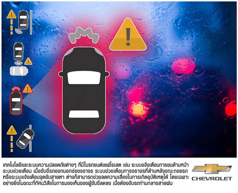การขับรถในขณะฝนตกมีความเสี่ยงที่รถจะลื่นไถลออกนอกช่องจราจรมากกว่าขณะขับขี่ในสภาพอากาศปกติถึง 4 เท่า นอกจากนี้ อุบัติเหตุที่เกิดจากการขับรถออกนอกช่องจราจรนั้นมีมากกว่าครึ่งหนึ่งของอุบัติเหตุรถชนทั้งหมดที่มีผู้เสียชีวิต ระบบป้องกันการชน เช่น ระบบช่วยเตือน เมื่อขับขี่รถออกนอกช่องจราจรในรถยนต์เชฟโรเลตนั้นได้รับการยอมรับว่าช่วยลดอุบัติเหตุและการบาดเจ็บจากการชนได้เป็นอย่างมาก