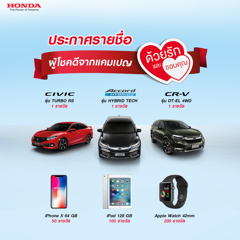 ฮอนด้า ประกาศรายชื่อผู้โชคดีที่ได้รับ ฮอนด้า แอคคอร์ด ไฮบริด ซีอาร์-วี และซีวิค พร้อมรางวัลอื่นๆ รวม 353 รางวัล จากแคมเปญ “ฮอนด้า ด้วยรักและขอบคุณ”