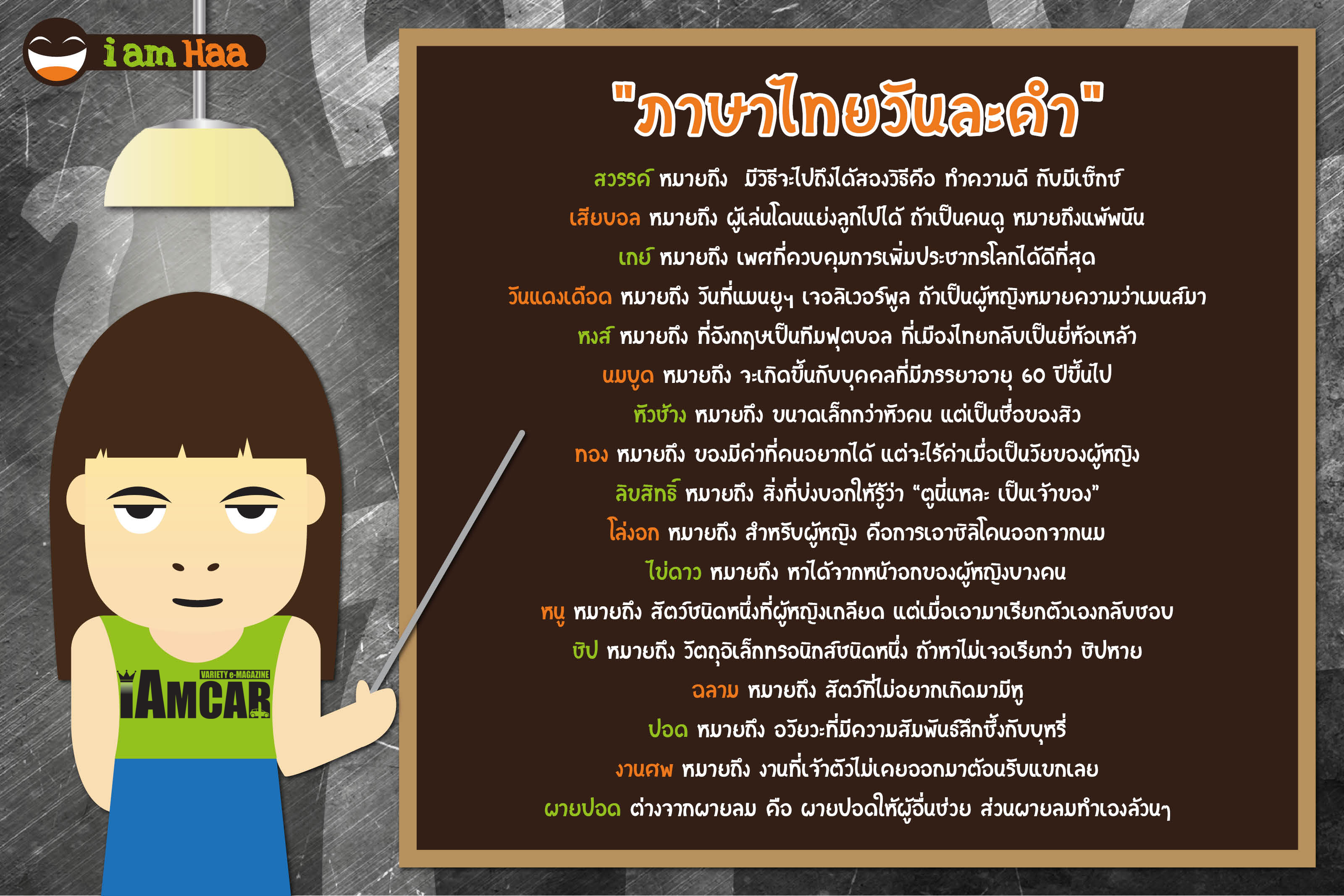 i am Haa พาขำขัน “ ภาษาไทย วันละคำ ”   สวรรค์                    หมายถึง มีวีซ่าจะไปถึงได้สองวิธี คือ ทำความดี  กับมีเซ็กส์ เสียบอล                  หมายถึง ผู้เล่นโดนแย่งลูกไปได้   ถ้าเป็นคนดู หมายถึง แพ้พนัน เกย์                         หมายถึง เพศที่ควบคุมการเพิ่มประชากรโลกได้ดีที่สุด วันแดงเดือด           หมายถึง วันที่แมนยูฯ เจอลิเวอร์พูล  ถ้าเป็นผู้หญิง หมายความว่า เมนส์มา หงส์                         หมายถึง ที่อังกฤษเป็นทีมฟุตบอล  ที…