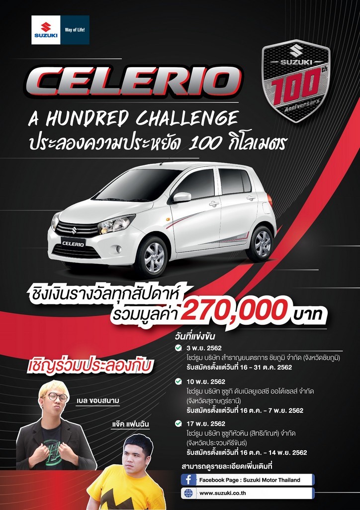 ในการนี้ ซูซูกิ มอเตอร์ (ประเทศไทย) จึงได้ร่วมมือกับทางผู้จำหน่ายรถยนต์ซูซูกิอย่างเป็นทางการ จัดกิจกรรม “CELERIO A HUNDRED CHALLENGE” เฉลิมฉลองโอกาสครบ 100 ปี ด้วยการแข่งขันขับรถประหยัดน้ำมัน ซูซูกิ เซเลริโอ เพื่อเป็นการต่อยอดและตอกย้ำภาพลักษณ์ความเป็นรถยนต์นั่งขนาดคอมแพ็คคุณภาพเกินตัว ให้กำลังและความคล่องตัวสูง มีสมรรถนะการขับที่ดี ในขณะที่มีอัตราการสิ้นเปลืองน้ำมันเชื้อเพลิงต่ำ เป็นมิตรกับสิ่งแวดล้อม ซึ่ง “ซูซูกิ เซเลริโอ” ถือเป็นรถยนต์อีโคคาร์ที่มีความคุ้มค่า เหมาะสำหรับผู้ที่ใช้ชีวิตในเมือง ต้องการมองหารถใช้งานในชีวิตประจำวัน ตอบโจทย์ด้านความคล่องตัวในทุกๆ ด้าน เช่น จอดง่าย การบรรทุกสิ่งของ มีพื้นที่โดยสารกว้างใช้งานได้จริง รวมถึงยังเป็นที่ยอมรับของตลาดในต่างประเทศอย่างกว้างขวาง โดยมียอดส่งออกจำหน่ายกว่า 160,000 คัน
