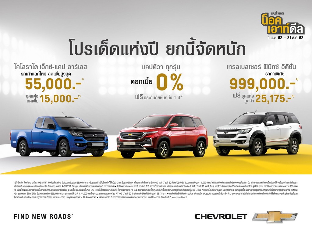 เชฟโรเลต ประเทศไทย นำเสนอ “เชฟโรเลต น็อค เอ้าท์ ดีล”* โปรโมชั่นเด็ดส่งท้ายปี เพื่อให้ลูกค้าเป็นเจ้าของรถเชฟโรเลตทุกรุ่นได้ง่ายยิ่งขึ้น ทั้งอัตราดอกเบี้ย 0 เปอร์เซ็นต์ สำหรับรถอเนกประสงค์ แคปติวา ใหม่ ทุกรุ่น ข้อเสนอพิเศษพร้อมฟรีชุดแต่งรอบคันสำหรับรถอเนกประสงค์ เทรลเบลเซอร์ และแคมเปญนำรถเก่าแลกซื้อรถใหม่รับส่วนลดเพิ่มเติมสูงสุด 85,000 บาท สำหรับรถกระบะ โคโลราโด ซึ่งเป็นข้อเสนอเดียวกับงานมอเตอร์เอ็กซ์โป 2019