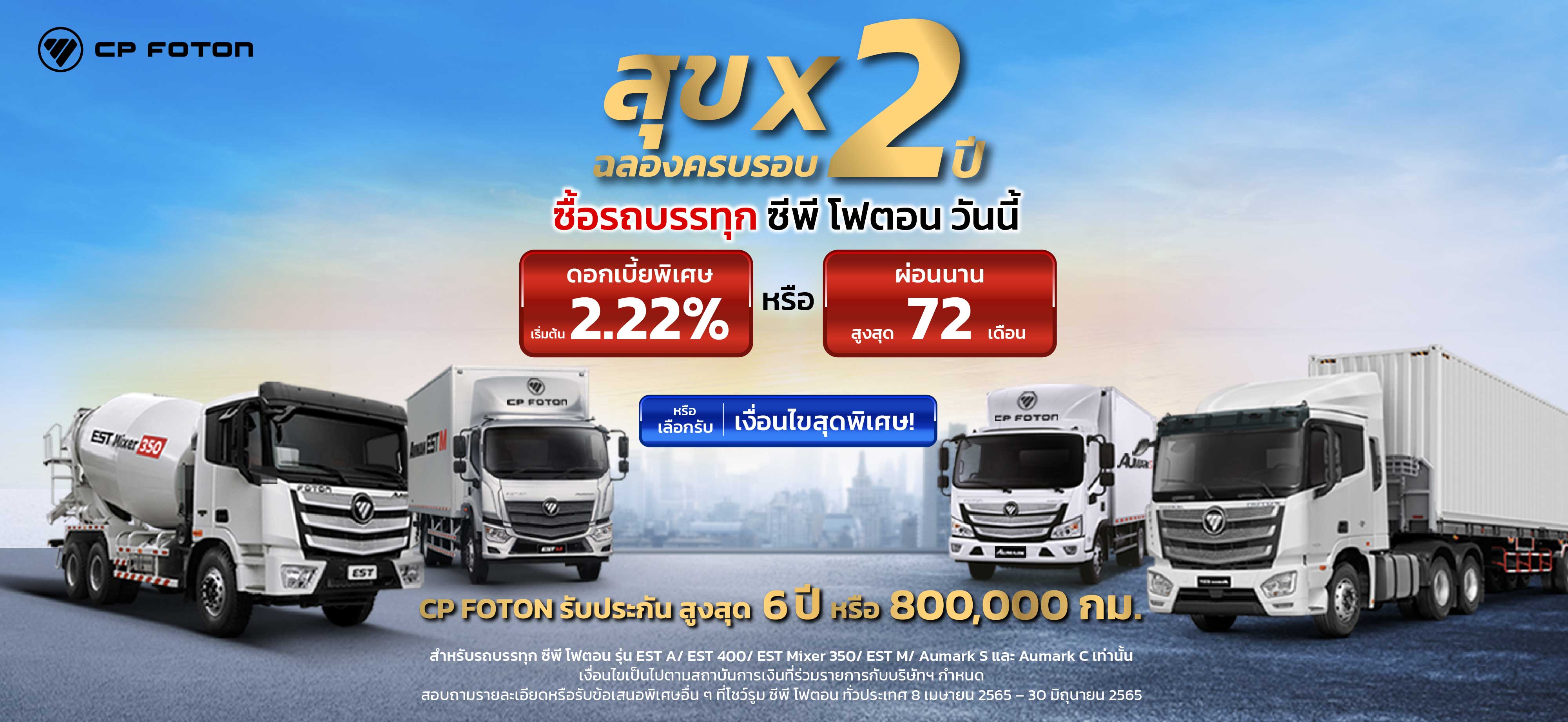 นายกฤษณะ เศรษฐธรางกูร กรรมการผู้จัดการ บริษัท ซีพี โฟตอน เซลส์ จำกัด ผู้นำเข้าและจำหน่ายรถเพื่อการพาณิชย์แบรนด์ ซีพี โฟตอน แต่เพียงผู้เดียว กล่าวว่า ซีพี โฟตอน พร้อมผู้แทนจำหน่าย ซีพี โฟตอน ทั่วประเทศ ร่วมคืนกำไรให้ลูกค้า ด้วยแคมเปญ “สุขคูณสอง ฉลองครบรอบ 2 ปี ซีพี โฟตอน” จัดโปรดอกเบี้ยพิเศษ 2.22% หรือผ่อนนานสูงสุด 72 เดือน สำหรับรถบรรทุก และดอกเบี้ยต่ำสุด 0% พร้อมฟรีประกันภัยชั้น 1 สำหรับรถบัส ตั้งแต่วันที่ 8 เมษายน 2565 ไปจนถึง วันที่ 30 มิถุนายน 2565 สำหรับลูกค้าผู้ประกอบการที่ซื้อรถบรรทุก ซีพี โฟตอน รุ่น Auman EST A, EST 400, EST Mixer 350, EST M, Aumark S และ Aumark C สามารถเลือกรับดอกเบี้ยพิเศษเริ่มต้น 2.22% ผ่อนนาน 48 เดือน หรือเลือกผ่อนนานสูงสุด 72 เดือน อัตราดอกเบี้ยปกติ หรือเลือกผ่อน 60 เดือน รับดอกเบี้ย 2.72% หรือเลือกรับเงื่อนไขสุดพิเศษ พร้อมยืนยันตอกย้ำการรับประกันคุณภาพสำหรับรถบรรทุกสูงสุดนาน 6 ปี หรือ 800,000 กม. แล้วแต่อย่างใดอย่างหนึ่งถึงก่อนเหมือนเดิม! และสำหรับรถมินิบัส ซีพี โฟตอน รุ่น AUV รถโดยสารมินิบัส ขนาด 7.3 เมตร 20+1 ที่นั่ง ซีพี โฟตอน ก็มีโปรโมชั่นดี ๆ ไว้รองรับ เช่นกัน ด้วยดอกเบี้ยพิเศษ 0% นาน 48 เดือน ดาวน์เริ่มต้น 15% ฟรี ประกันภัยชั้น 1 หรือ เลือกรับดอกเบี้ย 0.69% ผ่อนนาน 60 เดือน ดาวน์เริ่มต้น 15% ฟรี ประกันภัยชั้น 1 หรือ เลือกรับเงื่อนไขสุดพิเศษ ซึ่งท่านสมามารถสอบถามรายละเอียดจากผู้แทนจำหน่าย ซีพี โฟตอน ที่ร่วมรายการทั่วประเทศ โดยเงื่อนไขเป็นไปตามสถาบันการเงินที่ร่วมรายการกับบริษัทฯ กำหนด