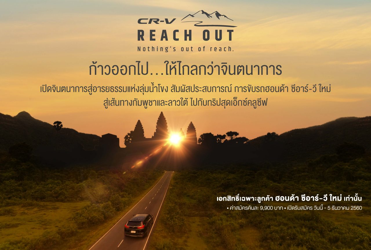 บริษัท ฮอนด้า ออโตโมบิล (ประเทศไทย) จำกัด เชิญชวนลูกค้าเจ้าของรถยนต์ฮอนด้า ซีอาร์-วี ใหม่เปิดประสบการณ์การขับขี่บนเส้นทางประเทศกัมพูชาและลาวใต้แบบเอ็กซ์คลูซีฟกับทริป “CR-V Reach Out ก้าวออกไป…ให้ไกลกว่าจินตนาการ” ร่วมสัมผัสอารยธรรมแห่งลุ่มแม่น้ำโขงที่นครวัด เมืองมรดกโลกแห่งความศรัทธา ตื่นตากับความมหัศจรรย์ของน้ำตกคอนพะเพ็ง พร้อมกิจกรรมให้ร่วมสนุกตลอดการเดินทาง 5 วัน 4 คืน