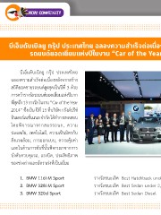 บีเอ็มดับเบิลยู กรุ๊ป ประเทศไทย ฉลองความส�าเร็จต่อเนื่องคว้า 13 รางวัล รถยนต์ยอดเยี่ยมแห่งปีในงาน “Car of the Year 2014” บีเอ็มดับเบิลยู กรุ๊ป ประเทศไทย ฉลองความส�าเร็จต่อเนื่องหลังจากสร้าง สถิติยอดขายรถยนต์สูงสุดเป็นปีที่ 3 ด้วย การคว้ารางวัลรถยนต์ยอดเยี่ยมแห่งปีมาก ที่สุดถึง 13 รางวัล ในงาน “Car of the Year 2014” ซึ่งเป็น ปีที่ 15 ที่บริษัท กรังด์ปรีซ์ อินเตอร์เนชั่นแนล จ�ากัด ได้ท�าการทดสอบ โดยพิจารณาจากสมรรถนะ, ความ ปลอดภัย, เทคโนโลยี, ความเป็นมิตรกับ สิ่งแวดล้อม, การออกแบบ, ความคุ้มค่า และในด้านการขับขี่นั้นพิจารณาจากการ บังคับควบคุมรถ, แรงบิด, ประสิทธิภาพ ของช่วงล่างและอัตราเร่งที่เป็นเยี่ยม 1. BMW 116i M Sport รางวัลชนะเลิศ Best Hatchback under 1,600 cc 2. BMW 328i M Sport รางวัลชนะเลิศ Best Sedan under 2,000 cc 3. BMW 320d Sport รางวัลชนะเลิศ Best Sedan Diesel