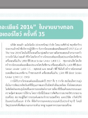 ฮอนด้าคว้า 3 รางวัล “คาร์ออฟเดอะเยียร์ 2014” ในงานบางกอก อินเตอร์เนชั่นแนล มอเตอร์โชว์ ครั้งที่ 35 บริษัท ฮอนด้า ออโตโมบิล (ประเทศไทย) จ�ากัด โดยนายพิทักษ์ พฤทธิสาริกร ประธานเจ้าหน้าที่บริหารปฏิบัติการ รับรางวัลรถยนต์ยอดเยี่ยมแห่งปี 2557 (Car of The Year 2014) โดยในปีนี้รถยนต์ในกลุ่มพลังงานทางเลือกของฮอนด้าสามารถคว้า 3 รางวัล ได้แก่ ฮอนด้า ซีวิค ไฮบริด คว้ารางวัลรถยนต์ยอดเยี่ยมประเภทไฮบริดซีดาน เครื่องยนต์ไม่เกิน 1,800 ซีซี (Best Sedan Under 1,800 C.C. - Hybrid) แจ๊ซ ไฮบริด คว้ารางวัลรถยนต์ยอดเยี่ยมประเภทไฮบริดซีดาน เครื่องยนต์ไม่เกิน 1,600 ซีซี (Best Sedan Under 1,600 C.C. - Hybrid) และ ฮอนด้า ซิตี้ ซีเอ็นจี คว้ารางวัลรถยนต์ ยอดเยี่ยมประเภทซีดาน ก๊าซธรรมชาติ เครื่องยนต์ไม่เกิน 1,500 ซีซี (Best Sedan Under 1,500 C.C. CNG) การได้รับรางวัลรถยนต์ยอดเยี่ยมแห่งปี 2557 ถึง 3 รางวัล สะท้อนถึงความมุ่ง มั่นในการพัฒนาผลิตภัณฑ์ที่มีคุณภาพและเป็นมิตรกับสิ่งแวดล้อม ทั้งยังตอบสนอง ไลฟ์สไตล์ของคนรุ่นใหม่ที่มองหารถยนต์พลังงานทางเลือกที่เปี่ยมด้วยสมรรถนะและ ความคุ้มค่าตลอดการใช้งาน โดยรางวัลนี้เป็นผลการตัดสินจากสมาคมวิศวกรรมยาน ยนต์ไทย สมาคมผู้สื่อข่าวรถยนต์และรถจักรยานยนต์ไทย และบริษัท กรังด์ปรีซ์ อินเตอร์เนชั่นแนล จ�ากัด ที่จัดกิจกรรมทดสอบรถยนต์เป็นประจ�าทุกปี โดยมี วัตถุประสงค์เพื่อพัฒนาและยกระดับมาตรฐานอุตสาหกรรมยานยนต์ไทย