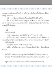 สามารถถ่ายภาพกับรถยนต์มิตซูบิชิ มิราจ ที่โชว์รูม หรือที่อื่นๆ หรือกับสื่อต่างๆที่เกี่ยว กับมิตซูบิชิ มิราจได้) • ขั้นที่ 3 : จากนั้นกดแชร์เพื่อเชิญเพื่อนมาโหวตให้ท่านให้มากที่สุด • ขั้นที่ 4 : ท่านที่ได้รับคะแนนโหวตสูงสุด 20 ท่านแรก จะมีเจ้าหน้าที่ติดต่อ กลับ เพื่อนัดหมายในการเตรียมเอกสารตัวจริง เพื่อยืนยันสิทธิ์และเข้าร่วมกิจกรรม รอบออดิชั่นในล�าดับต่อไป รางวัล : ส�าหรับรอบออดิชั่น • รางวัล Popular Vote มูลค่า 10,000 บาท** จ�านวน 20 รางวัล • สิทธิ์ในการร่วมกิจกรรมรอบออดิชั่น โดยมีคณะกรรมการการตัดสิน จาก ตัวแทน บริษัท มิตซูบิชิ มอเตอร์ส (ประเทศไทย) นิชคุณ หรเวชกุล และบริษัท โฆษณา ส�าหรับผู้ชนะเลิศ • เงินสดมูลค่า 30,000 บาท** จ�านวน 5 รางวัล • สิทธิ์ในการร่วมกิจกรรมการถ่ายหนังโฆษณา มิตซูบิชิ มิราจ ร่วมกับนิชคุณ หรเวชกุล ผู้สนใจเข้าร่วมกิจกรรมสามารถดูรายละเอียดเพิ่มเติมได้ที่ Mirage Facebook หมายเหตุ : * ขอสงวนสิทธิ์ในการตรวจสอบเอกสารเพิ่มเติมตามที่บริษัทก�าหนด ** ผู้ที่ได้รับรางวัลต้องจ่ายภาษี หัก ณ ที่จ่าย 5% ของมูลค่าของรางวัล