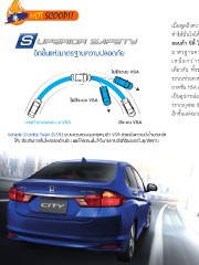 เมื่อพูดถึงความปลอดภัย ยิ่ง ท�าให้มั่นใจได้เกินใคร เพราะ ฮอนด้า ซิตี้ ใหม่ มาพร้อมกับ อีกขั้นแห่งมำตรฐำนควำมปลอดภัย มาตรฐานความปลอดภัยที่ เหนือกว่ารถยนต์ระดับ เดียวกัน ทั้งระบบเบรก ABS ระบบช่วยควบคุมการทรงตัว VSA ระบบช่วยการออกตัวขณะอยู่บนทาง ลาดชัน HSA และสัญญาณไฟฉุกเฉินอัตโนมัติขณะเบรกกะทันหัน ESS ซึ่ง เป็นอุปกรณ์มาตรฐานความปลอดภัยแลลยนตรกรรมระดับพรีเมี่ยม อาทิ ระบบถุงลม 6 ต�าแหน่ง กล้องส่งภาพด้านหลังปรับมุมมองได้ 3 ระดับ สู่ อีกขั้นแห่งมาตรฐานความปลอดภัย ที่ให้คุณมั่นใจทุกการเดินทาง Vehicle Stability Assist (VSA) ระบบช่วยควบคุมกำรทรงตัว VSA ช่วยเพิ่มควำมมั่นใจขณะเข้ำ โค้ง ป้องกันกำรลื่นไหลออกด้ำนข้ำง และให้ควำมมั่นใจในกำรทรงตัวที่ดีของรถในทุกทิศทำง