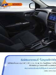 สัมผัสยนตรกรรมที่ “ไม่หยุดแค่ค�ำว่ำที่สุด” ในทุกๆ ด้ำน กับ ฮอนด้ำ ซิตี้ ใหม่ ที่มีให้เลือกทั้งหมด 6 รุ่น S MT, S AT, V, V+, SV และ SV+ โดยมีให้เลือก 7 สี ได้แก่ สีน�้ำตำลโกลเด้น (เมทัลลิก) สีเทำโมเดิร์นสตีล (เมทัลลิก) สีแดงคำร์เนเลียน (มุก) สีด�ำคริสตัล (มุก) และพิเศษสีน�้ำเงินบริลเลียนท์ สปอร์ตตี้ (เมทัลลิก) เฉพำะรุ่น SV และ CV+ สอบถำมรำยละเอีดยเพิ่มเติมได้ที่ศูนย์บริกำรฮอนด้ำทั่วประเทศ หรือดูข้อมูลได้ที่ www.honda.co.th/city หมำยเหตุ : อุปกรณ์มำตรฐำนอำจแตกต่ำงกันในแต่ละรุ่น