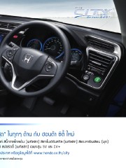 สัมผัสยนตรกรรมที่ “ไม่หยุดแค่ค�ำว่ำที่สุด” ในทุกๆ ด้ำน กับ ฮอนด้ำ ซิตี้ ใหม่ ที่มีให้เลือกทั้งหมด 6 รุ่น S MT, S AT, V, V+, SV และ SV+ โดยมีให้เลือก 7 สี ได้แก่ สีน�้ำตำลโกลเด้น (เมทัลลิก) สีเทำโมเดิร์นสตีล (เมทัลลิก) สีแดงคำร์เนเลียน (มุก) สีด�ำคริสตัล (มุก) และพิเศษสีน�้ำเงินบริลเลียนท์ สปอร์ตตี้ (เมทัลลิก) เฉพำะรุ่น SV และ CV+ สอบถำมรำยละเอีดยเพิ่มเติมได้ที่ศูนย์บริกำรฮอนด้ำทั่วประเทศ หรือดูข้อมูลได้ที่ www.honda.co.th/city หมำยเหตุ : อุปกรณ์มำตรฐำนอำจแตกต่ำงกันในแต่ละรุ่น