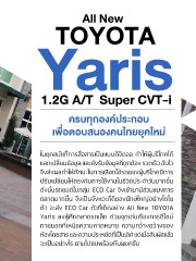 All New TOYOTA Yaris 1.2G A/T Super CVT-i ครบทุกองค์ประกอบ เพื่อตอบสนองคนไทยยุคใหม่ ในยุคสมัยที่การสื่อสารเป็นแบบดิจิตอล ท�าให้ผู้บริโภคได้ แลกเปลี่ยนข้อมูล และยังรับข้อมูลที่ถูกต้อง รวดเร็ว ฉับไว จึงส่งผลท�าให้ทัศนะในการเลือกใช้รถของผู้บริโภคมีการ ปรับเปลี่ยนให้ตรงกับการใช้งานในชีวิตประจ�าวันมากขึ้น ดังนั้นรถยนต์ในกลุ่ม ECO Car จึงเข้ามามีส่วนแบ่งการ ตลาดมากขึ้น จึงเป็นจังหวะที่ดีของยักษ์ใหญ่อย่างโตโย ต้า จะส่ง ECO Car ตัวที่เด็ดอย่าง All New TOYOTA Yaris ลงสู้ศึกตลาดรถเล็ก ด้วยจุดเด่นเรื่องการดีไซน์ ภายนอกที่เหนือความคาดหมาย ความกว้างขว้างของ ห้องโดยสาร และความประหยัดที่เป็นเลิศ แต่เมื่อสัมผัสแล้ว จะเป็นอย่างไร ตามไปชมพร้อมกับผมครับ