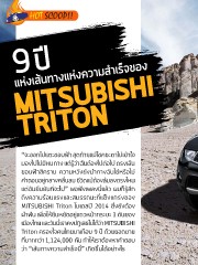 9 ปี แห่งเส้นทางแห่งความส�าเร็จของ MITSUBISHI TRITON “จะออกไปแตะขอบฟ้า สุดท้ายแม้โชคชะตาไม่เข้าใจ มองไปไม่มีหนทาง แต่รู้ว่าฉันต้องไปต่อไป ตรงเส้น ขอบฟ้าสีคราม ความหวังยังน�าทางฉันใช่หรือไม่ ค�าตอบอยู่กลางคลื่นลม ชีวิตแม้ต้องล้มลงตรงไหน แต่ฉันยืนยันที่จะไป” พอฟังเพลงนี้แล้ว ผมก็รู้สึก ถึงความร้อนแรงและสมรรถนะที่แข็งแกร่งของ MITSUBISHI Triton โมเดลปี 2014 ซึ่งยังต้อง ฝ่าฟัน เพื่อให้ยืนหยัดอยู่แถวหน้ากระบะ 1 ตันของ เมืองไทย และวันนี้เราคงปฎิเสธไม่ได้ว่า MITSUBISHI Triton ครองใจคนไทยมาเกือบ 9 ปี ด้วยยอดขาย ที่มากกว่า 1,124,000 คัน ท�าให้เราต้องหาค�าตอบ ว่า “เส้นทางความส�าเร็จนี้” เกิดขึ้นได้อย่างไร