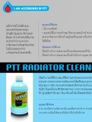 ผลิตจากน�้ามันพื้นฐาน คุณสมบัติพิเศษ ธรรมชาติคุณภาพสูง • มีความหนืดต�่า (High Quality Mineral • คุณสมบัติในการชะล้างสูง จึงสามารถชะล้างท�าความ Base Oil) ส�าหรับใช้ในการ สะอาด สิ่งสกปรกที่ตกค้างอยู่ในเครื่องยนต์ เครื่องจักร ชะล้างท�าความสะอาด ได้ดีเยี่ยม เครื่องยนต์ หรือเครื่องจักร ในขั้นตอนของการ ลักษณะการใช้งาน เปลี่ยนถ่ายน�้ามันหล่อลื่น ใช้ชะล้างท�าความสะอาดเครื่องยนต์ของรถยนต์ทั่วไป ใช้ชะล้างท�าความสะอาดเครื่องจักรในโรงงานอุตสาหกรรม PTT RADIATOR CLEANER เป็นน�้ายาเคมีที่มีคุณสมบัติในการชะล้างคราบสกปรกที่ติดอยู่ภายในหม้อน�้า รถยนต์ ตลอดจนท่อทางเดินของน�้าในเสื้อสูบของเครื่องยนต์ เช่น คราบ สนิม และตะกรัน คราบสกปรกเหล่านี้หากสะสมไว้นานๆ จะท�าให้เกิดการอุด ตันได้ เป็นผลให้ประสิทธิภาพการระบายความร้อนลดลง เครื่องยนต์จะร้อน จัด สูญเสียก�าลัง และ สิ้นเปลืองน�้ามันเชื้อเพลิงอีกด้วย คุณสมบัติพิเศษ สามารถขจัดคราบสนิม ตะกรัน และสิ่งสกปรกต่างๆ ตามช่องที่น�้าไหลผ่านในระบบ ระบายความร้อนให้สะอาดได้อย่างมีประสิทธิภาพ